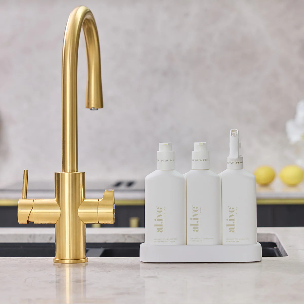 Lemon Myrtle & Honeydew Kitchen Trio Packs, each containing a 300ml dishwashing liquid, 300ml hand wash, a 300ml kitchen spray and matching tray.