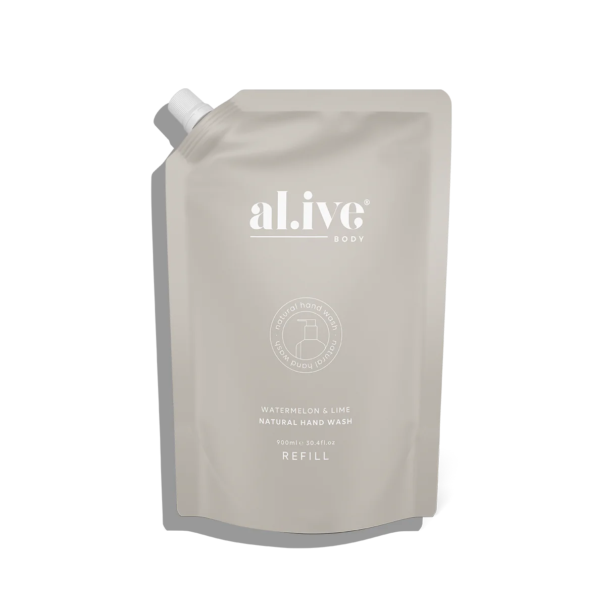 Refill your Watermelon & Lime bottle with our 1 L Hand Wash Refill. This sustainable refill solution is designed to reduce waste and offer a practical, eco-friendly way to top up your favourite al.ive body essentia