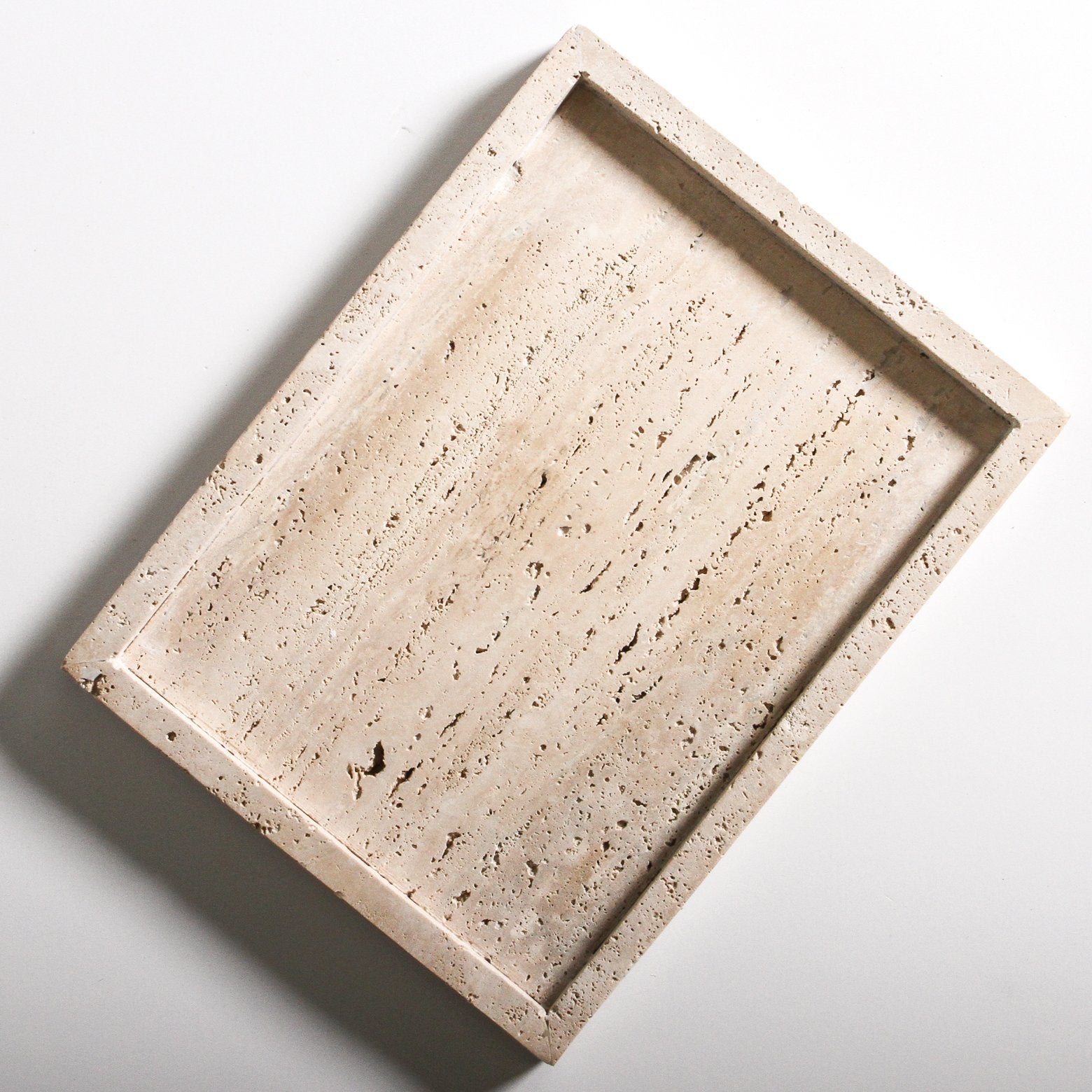 Crafted from natural travertine, our Lyssa Tray celebrates chic and minimal design. This beautiful tray can be used for myriad uses, but we think it makes the perfect catch all on your bedroom dresser for jewellery and bottles of perfume, or as a display stand in your bathroom for soaps and scented candles. No two Lyssa Trays are the same, as each will display different tones and patterns in the stone’s surface.