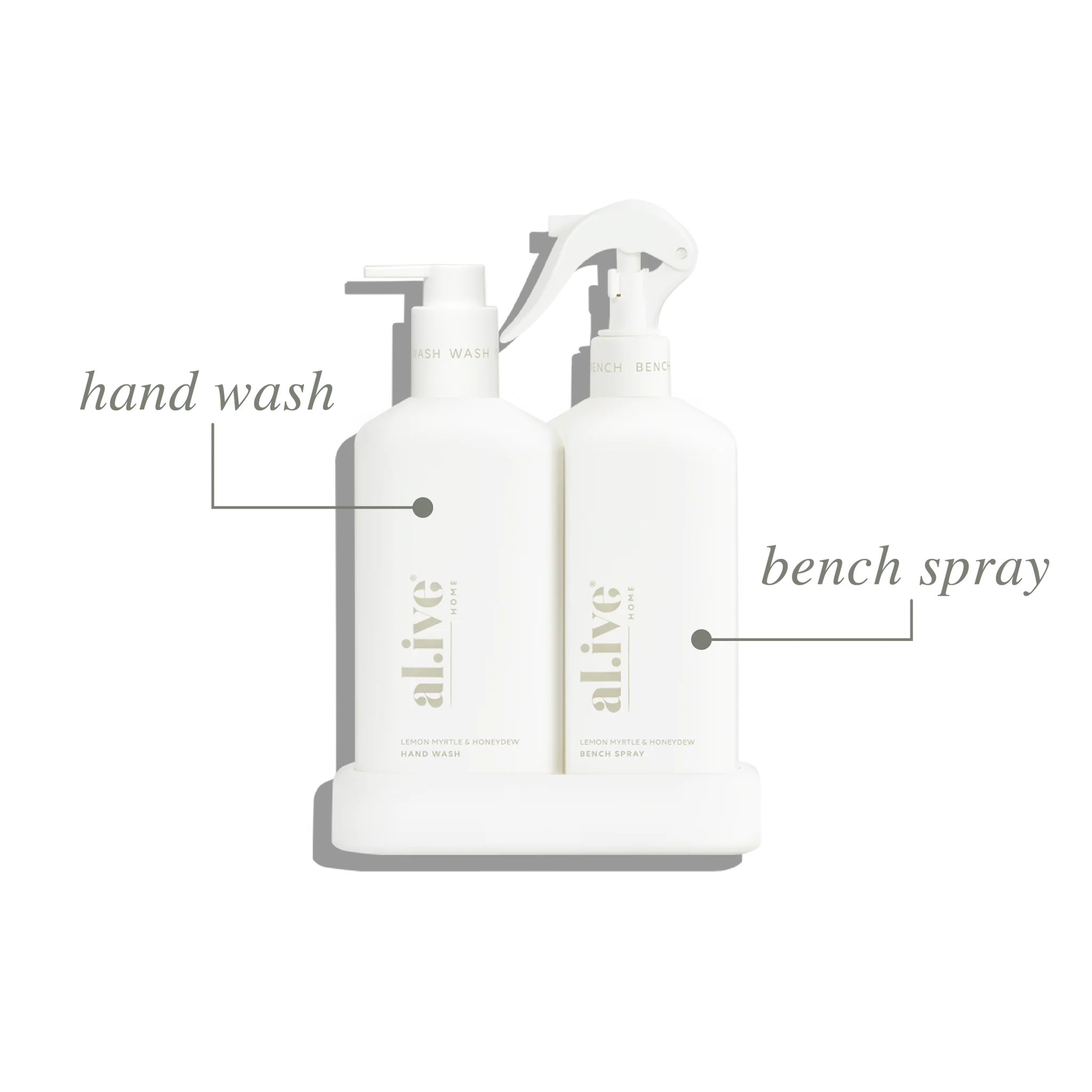 Enhance your kitchen routine with our Lemon Myrtle & Honeydew Kitchen Duo in crisp white. This set includes our Hand Wash and Bench Spray, conveniently nestled within a beautifully designed custom tray to elevate your kitchen countertop.