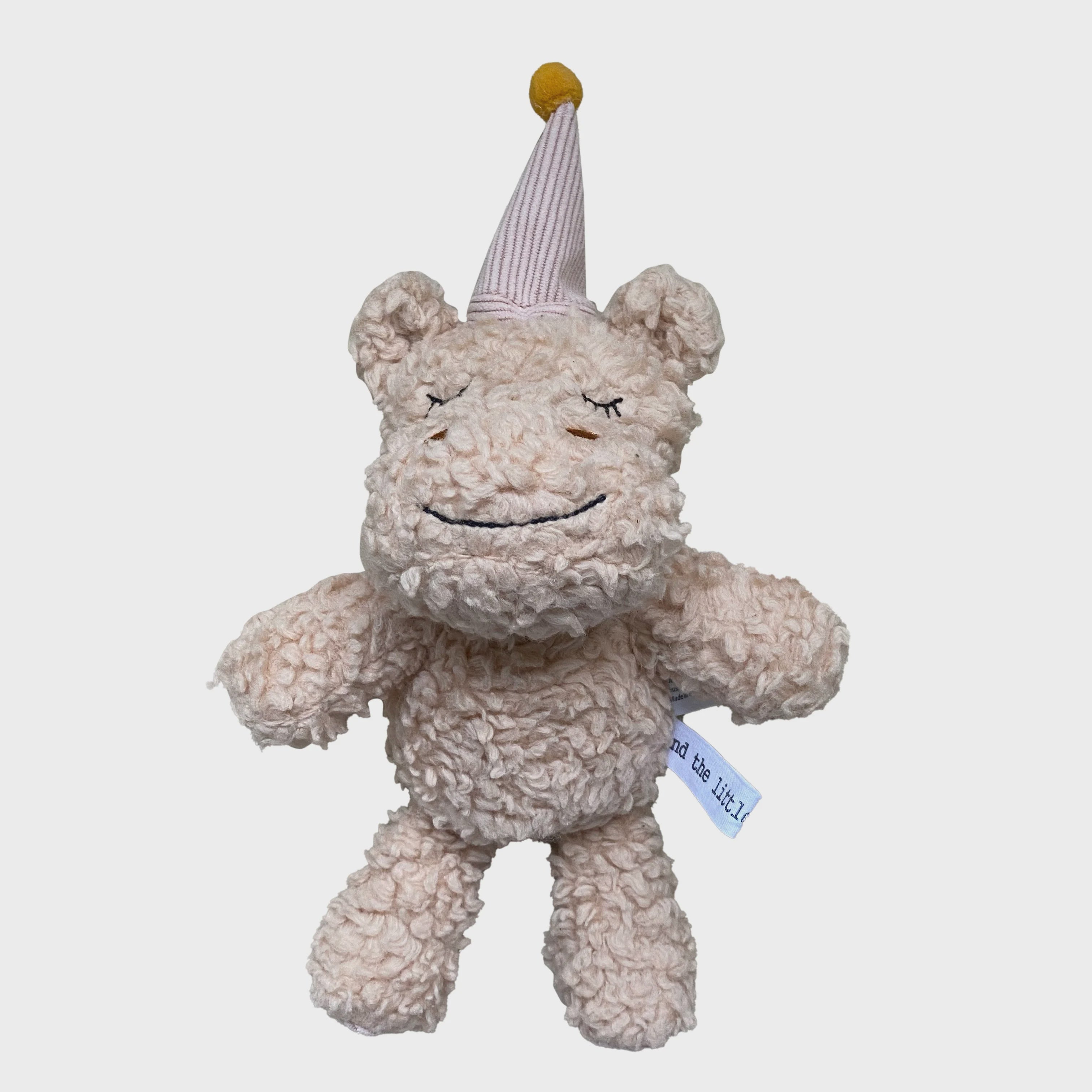 Betty Hippo loves to party and wears a blush pink party hat with mustard pom pom.