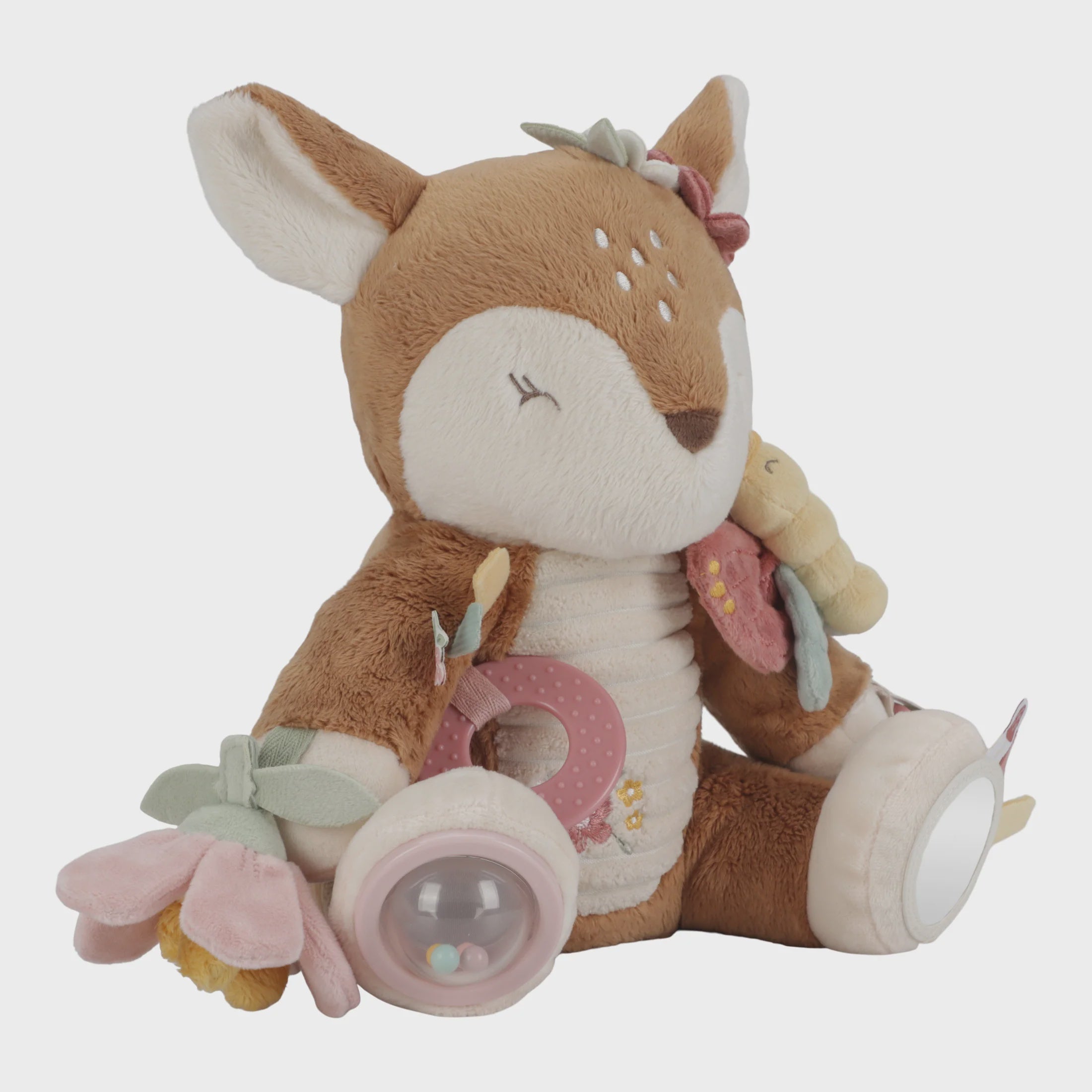 Hug and play! This lovely deer promises more than just cuddles. Discover all the engaging activities that it hides. There’s a crinkly butterfly on its shoulder, a rattling sound, and labels and flowers to touch and feel. The rings around the leg, the mirror on one foot, a strawberry tail – so many details to spark your little one’s curiosity. And after all that play, the adorable deer inspires the sweetest dreams about a Fairy Garden.