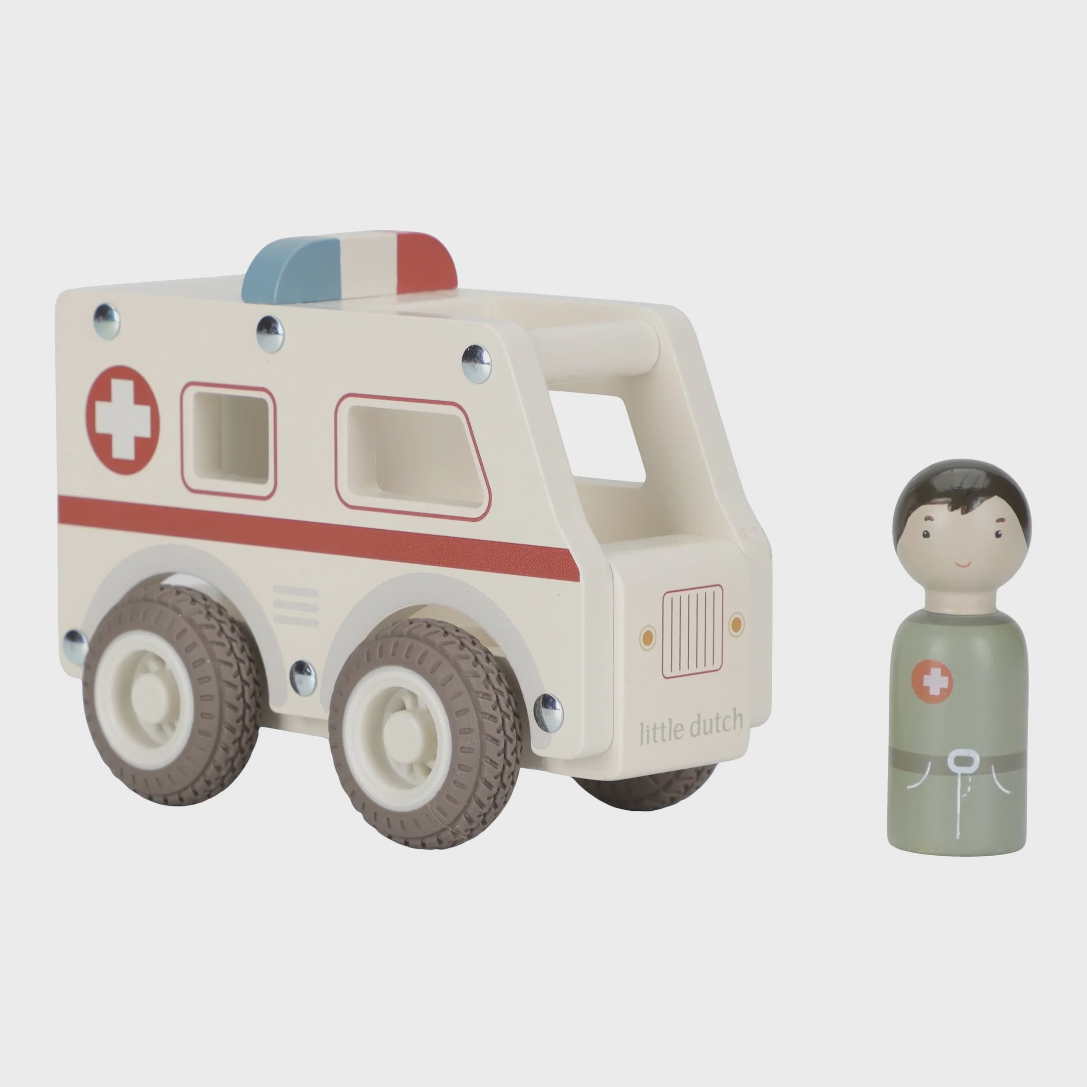 Siren on, time to help! This wooden ambulance with rubber wheels quickly brings patients to the hospital. Inside, there is space for a patient, and the set includes a wooden nurse. Drive as fast as possible to the emergency, bring the patient inside, and take good care of everyone. This ambulance toy makes role-playing even more fun. Will you help someone get better today?