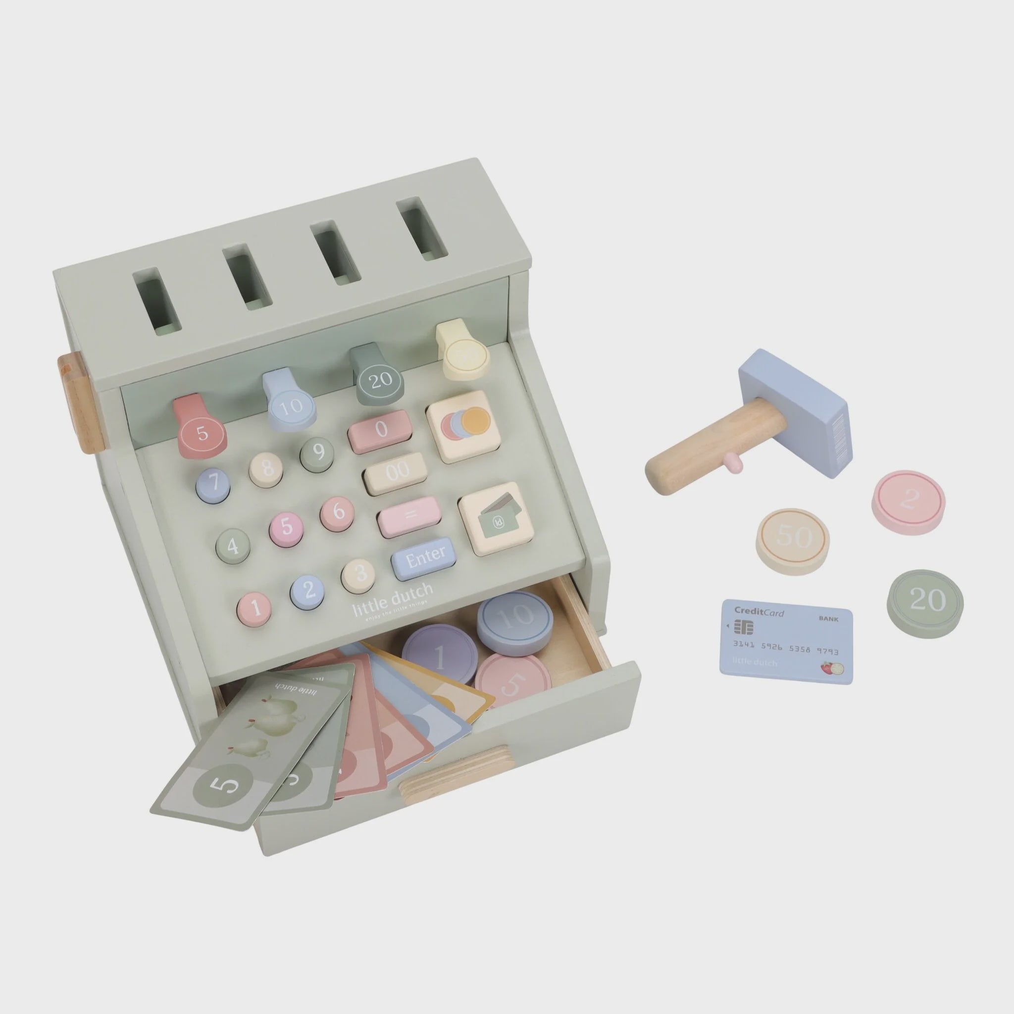 Calculate, scan, and pay up! With this wooden cash register, playing shop feels even more real. The register is equipped with a scanner, card reader, buttons, and a cash drawer for coins and bills. It also comes with a bank card, so customers can pay with cash or card. A fantastic way to playfully learn about money and numbers. What will you buy today?