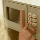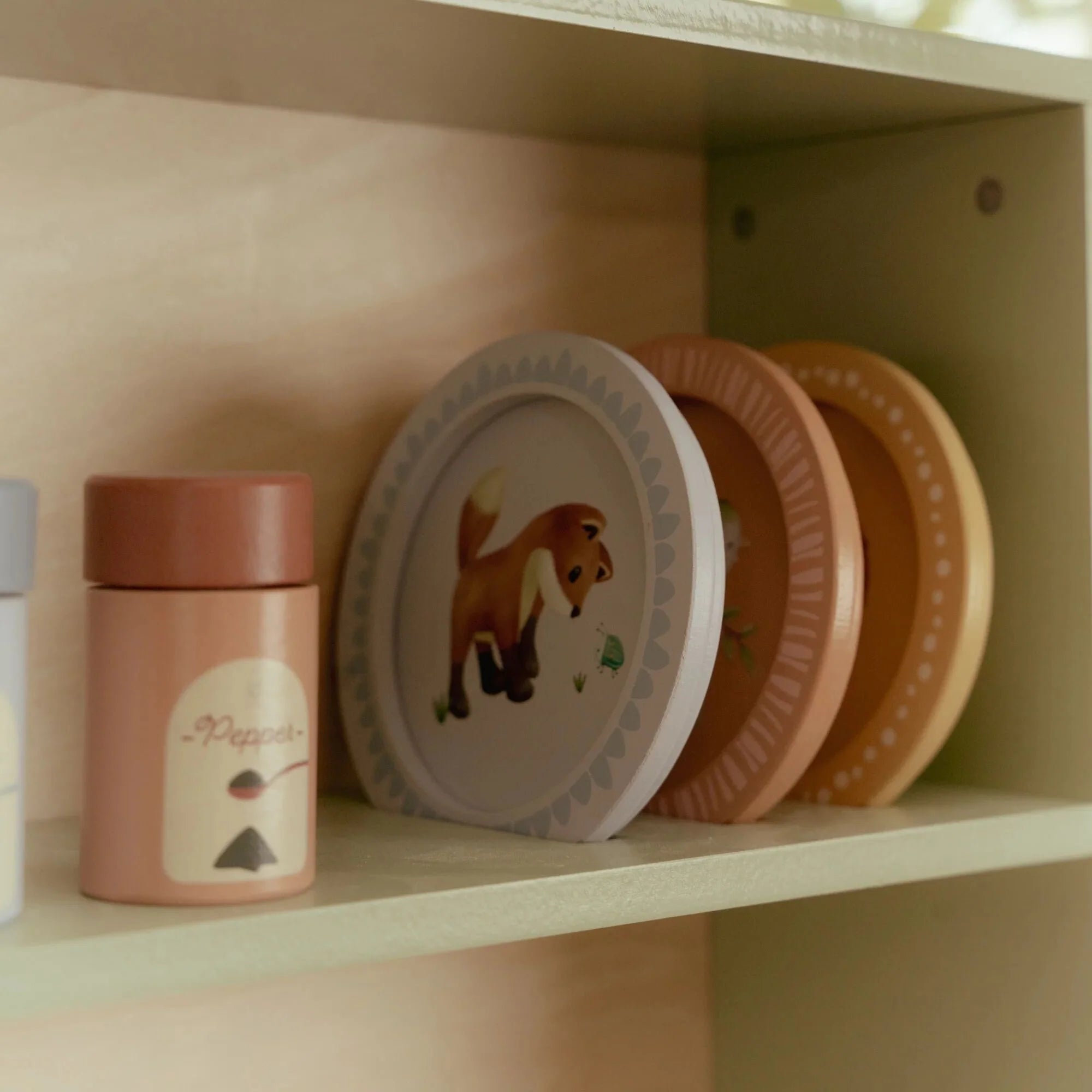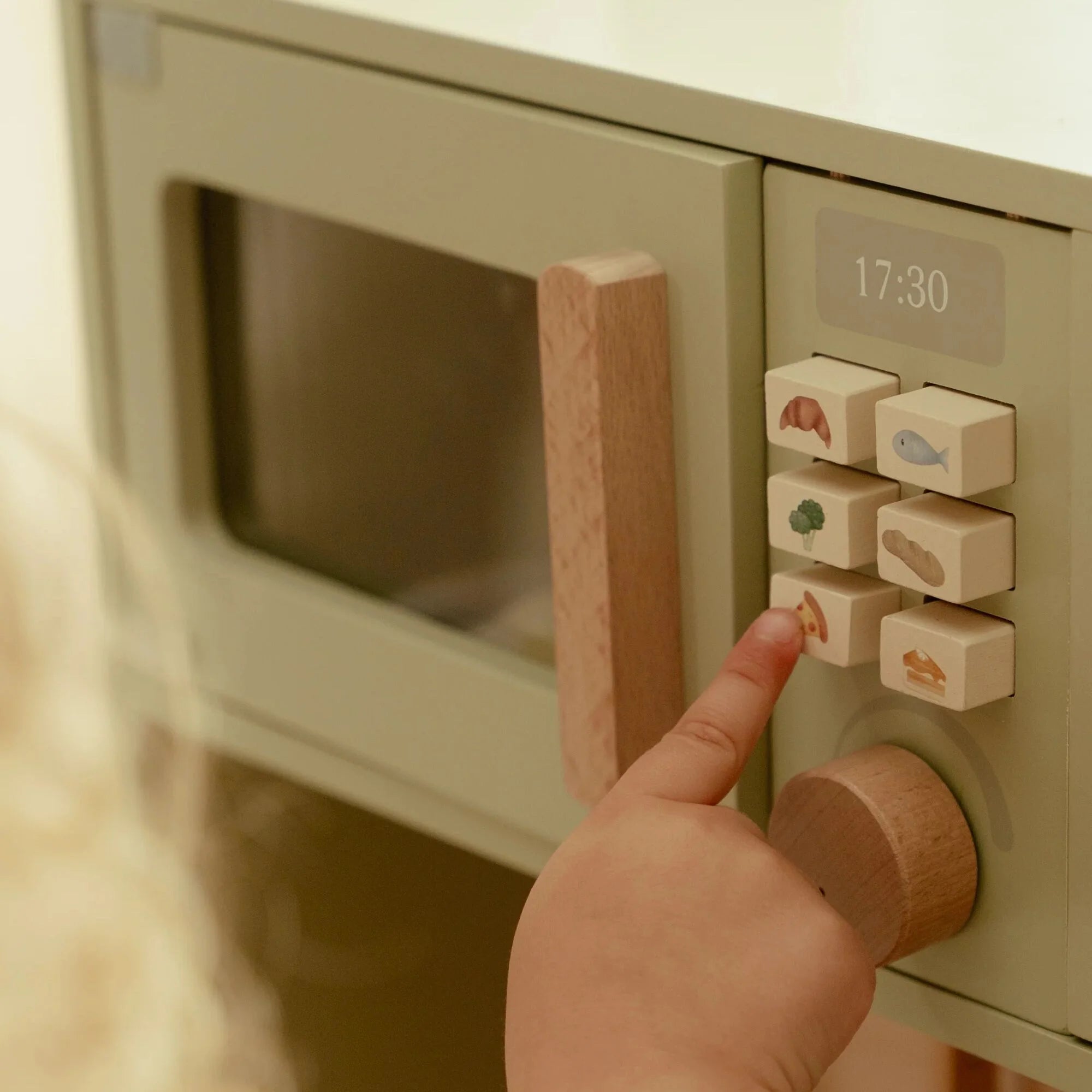 Little chefs can get to work in this beautiful mint-colored wooden play kitchen! Bake a delicious cake in the oven, cook fresh vegetables on the stove, or fry an egg in the pan. The kitchen comes fully equipped with two pans, cooking utensils, three plates, and a sink to wash hands. Also included: a bottle of olive oil, a salt and pepper set, and a cupboard to neatly store groceries. The microwave has real knobs with illustrations for extra play fun. What ’s cooking today?