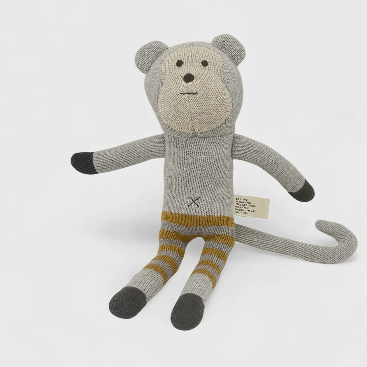 Sam the knitted monkey made with love from 100% cotton and filled with recycled polyester fibre. He's super soft and loves to play in the mud, build train sets, and make his sister mad.