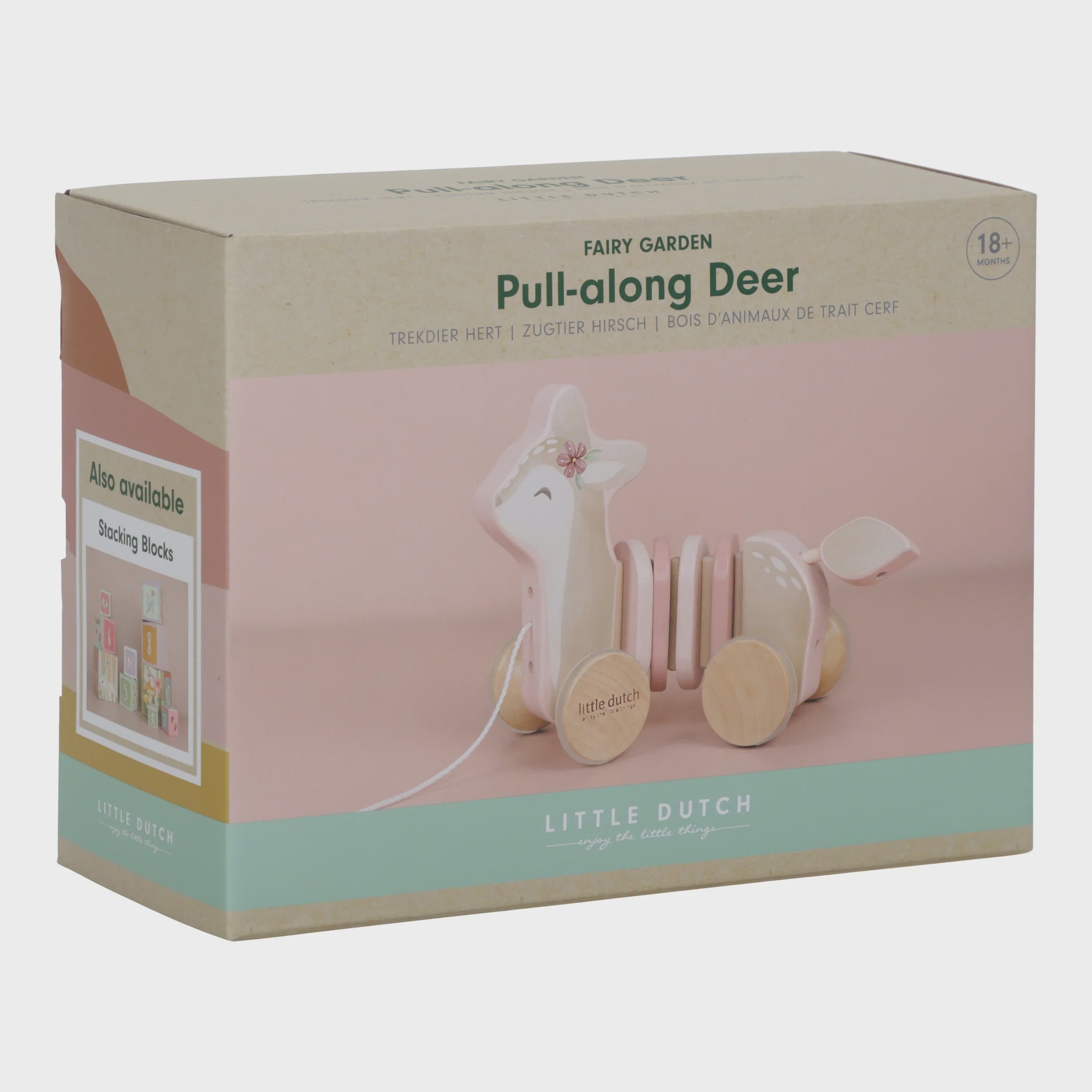 This little deer is ready for an adventure! Simply pull the string and watch as the deer gracefully follows along, whether you’re exploring the living room, navigating through hallways, or walking circles in your room. Go on enchanting journeys to the mystical Fairy Garden, where you and your deer friend will discover breathtaking flowers and magical wonders. Crafted from sturdy wood and adorned with colourful rings, this pull-along deer not only provides endless entertainment but also promotes walking and enhances motor skill development
