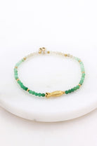 Featuring semi-precious olive green stones, this gold plated bracelet is a chic and earthy addition.