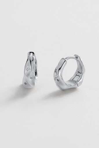 Add a touch of effortless luxury to your look with these Silver Organic Hoops. Featuring a fluid, molten texture and three delicate crystal accents, these earrings offer a modern twist on a classic silhouette. Their secure hinged design makes them perfect for comfortable, everyday wear—whether worn alone or as the centrepiece of a curated ear stack.