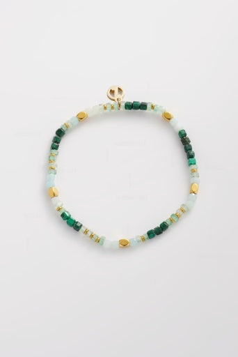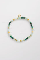 This stretch bracelet features an elegant blend of green and soft mint gemstones. Polished gold-tone spacers and a signature logo charm add a refined touch to the organic design. Its lightweight, boho style makes it a versatile choice for everyday wear or stacking with other pieces.