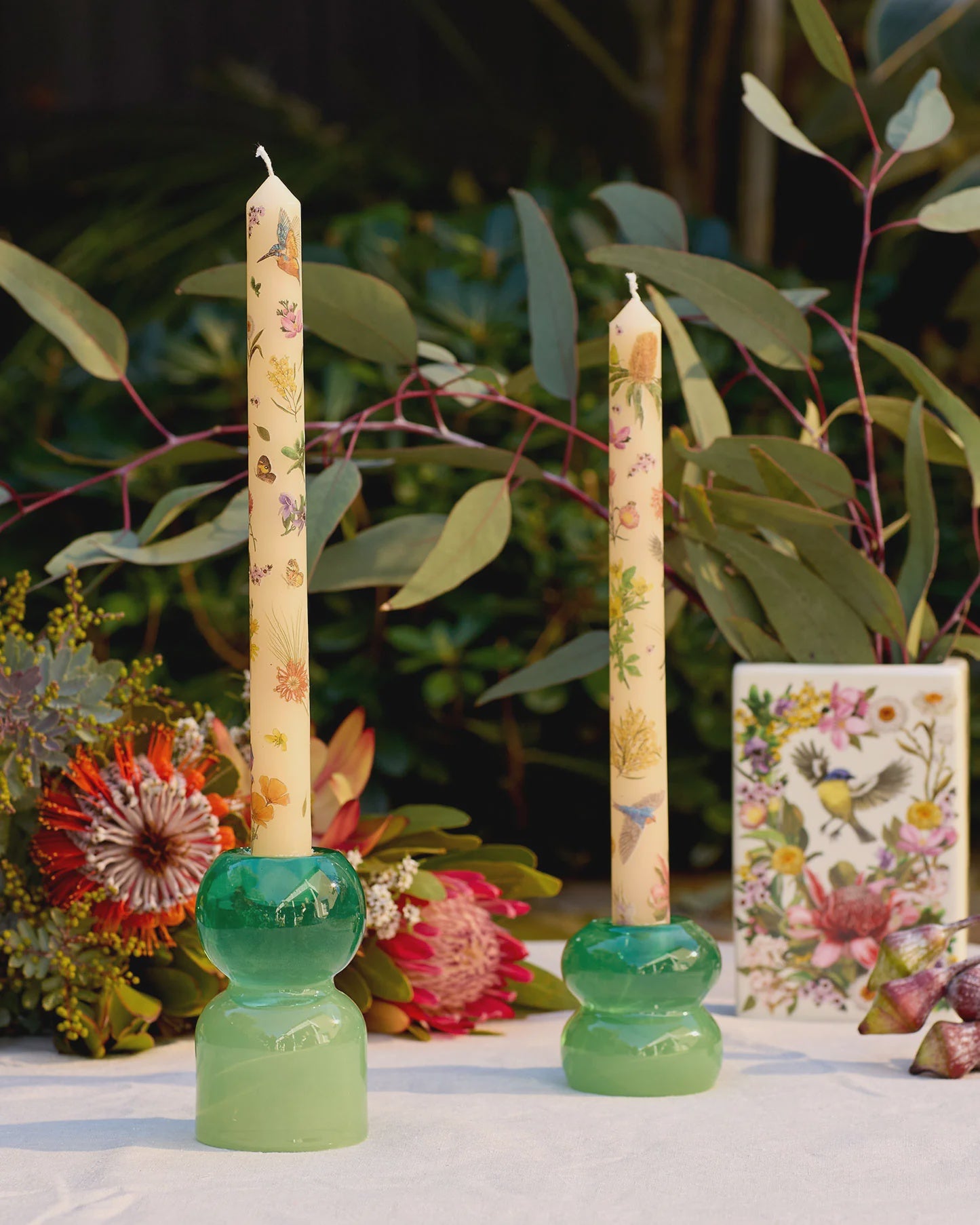 Our Beautifully Illustrated Dinner Candles are made from paraffin wax and feature a braided cotton wick. Unscented and lead-free, each candle stands 25cm tall and 2 cm wide, providing up to 6 hours of warm ambience.