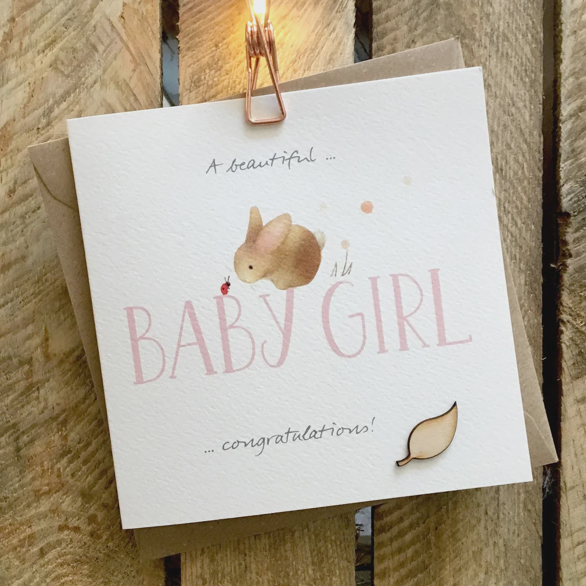 Card featuring a cute baby rabbit and ladybird sitting on top of a large pink BABY GIRL caption. Caption reads "A beautiful BABY GIRL... congratulations!"