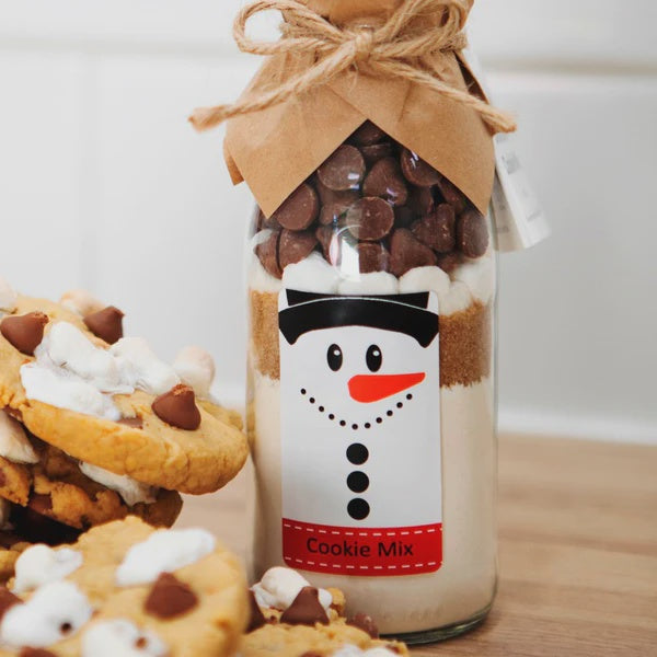 Each Mix contains our Signature Cookie Mix Base, topped with real Nestle Choc Bits and marshmallows just right for melting and dressed in our Friends of Christmas label, Kraft paper topper, jute twine and instructional swing tag (containing all the information you need to know - ingredients, allergens, nutritional information and most importantly how to bake method).