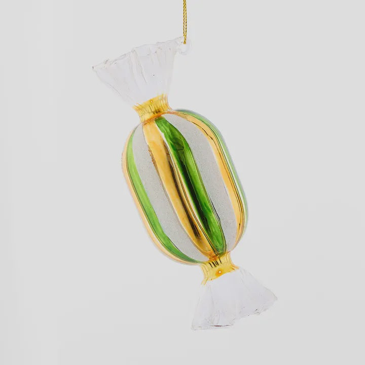 Shaped like a beautifully wrapped candy, this elegant ornament features shimmering gold and white stripes and comes in four stunning colours. Perfect for hanging on your tree, wreath, or garland, it brings a playful yet sophisticated sparkle to your holiday styling.