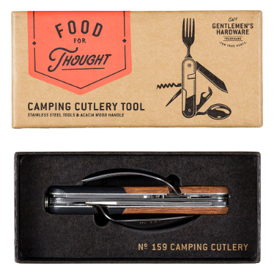 The handiest of compact camping accessories, each stainless steel utensil folds neatly into a smart wooden handle, and the fork and spoon are detachable for mealtimes. Comes in a sleek Gentlemen' s Hardware signature-style presentation box making this practical tool the perfect gift for camping enthusiasts everywhere.