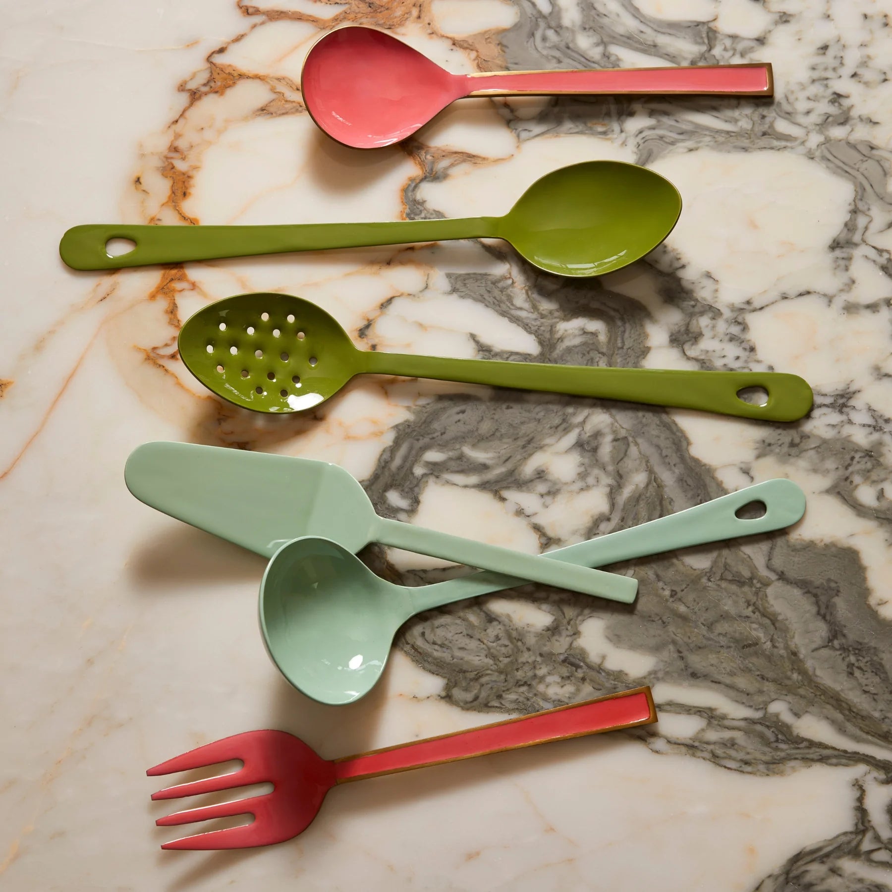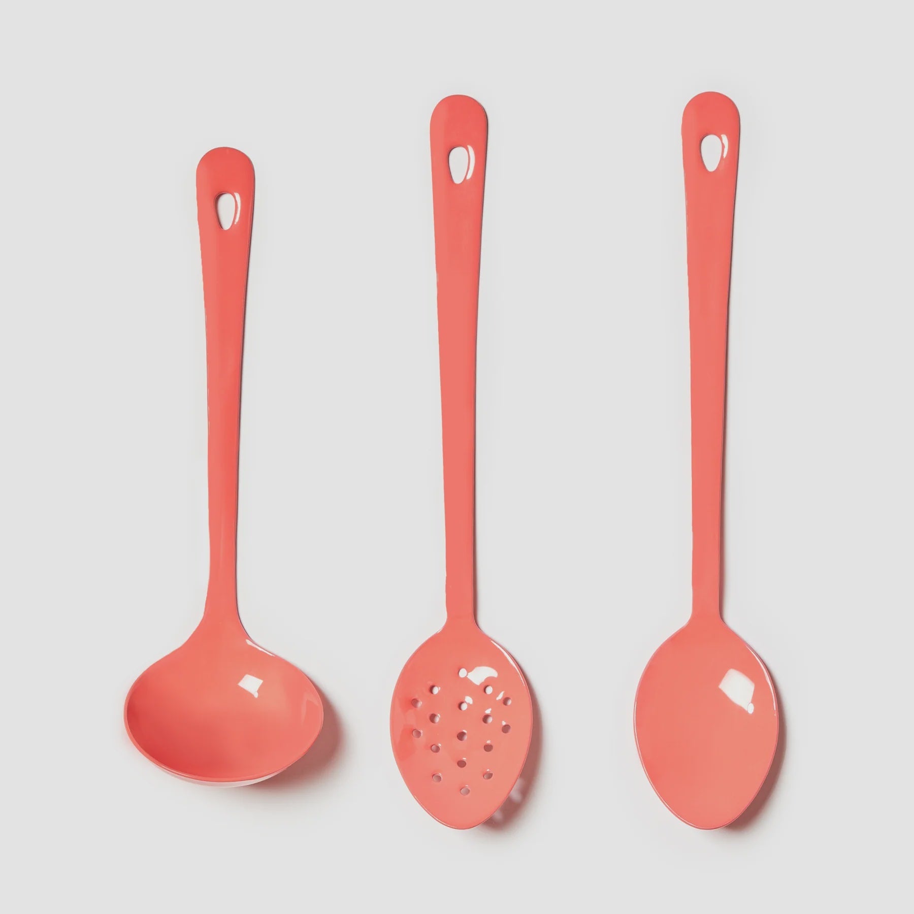 Upgrade your kitchen essentials with our Enamel Candy Pink Kitchen Utensil Set featuring a slotted spoon, serving spoon and ladle. Designed for both function and style, this versatile trio makes everyday cooking and serving effortless. Whether you're cooking for family dinners or hosting special gatherings, this mint green kitchen utensil set is a stylish and practical addition to any kitchen.