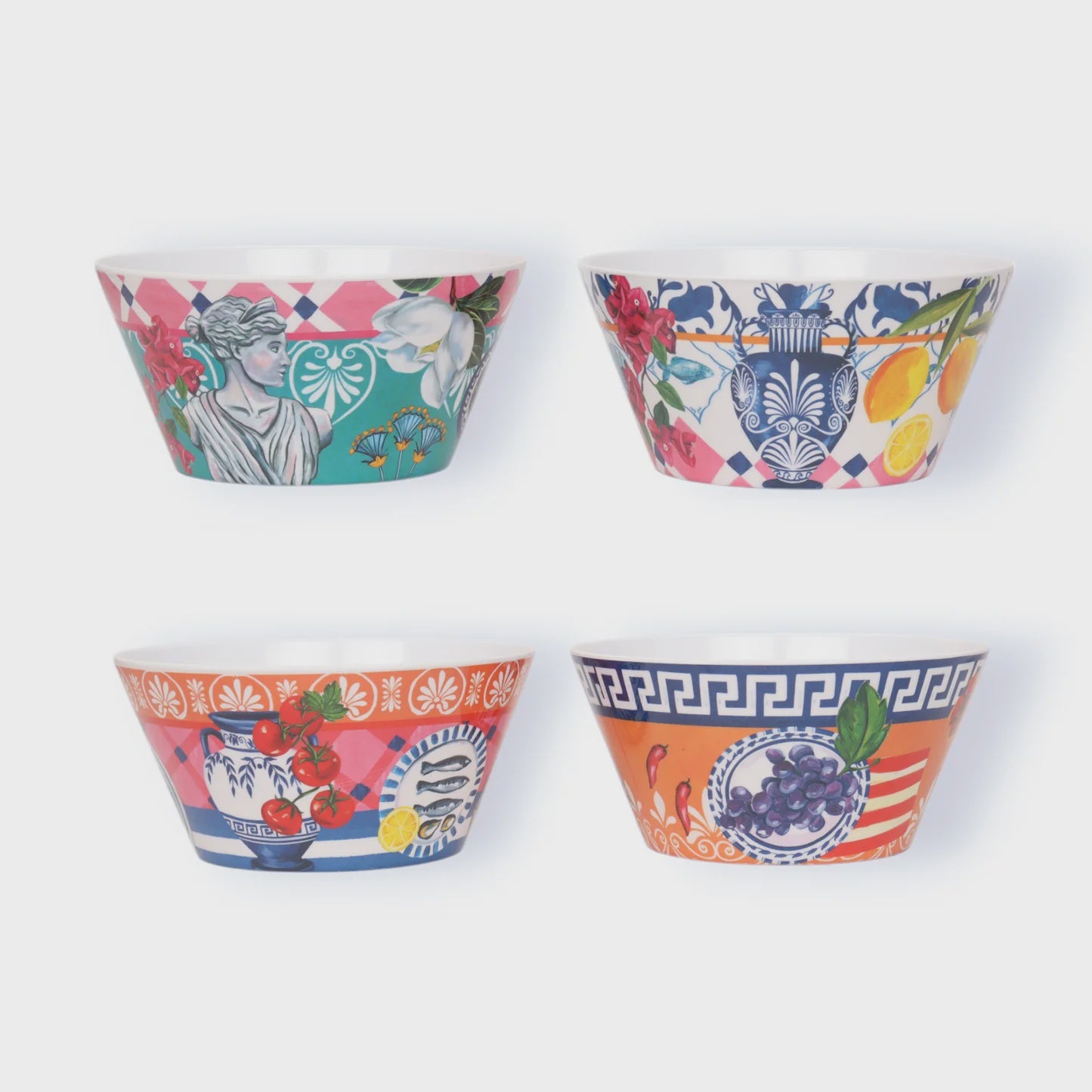 Crafted from durable melamine, this set of four bowls brings the vibrant flavours of the Mediterranean to your table with captivating illustrations. From fresh vegetables to olive oil to iconic greek ceramics, each bowl showcases the essence of Mediterranean indulgence, and with the convenience of being dishwasher safe, cleanup is a breeze. Elevate your dining experience and add a touch of Mediterranean flair to your meals with La La Land's Mediterranean Summer Bowl Set, perfect for using at home or taking out for picnics.