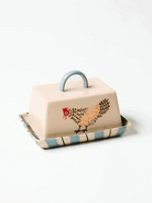 Two golden hens guard your butter in this charming earthenware dish complete with a thoughtfully designed handle and irregularly striped plate. Our Coop Butter Dish marries function with farmhouse character, meticulously hand-painted by artisans committed to preserving traditional craft techniques.