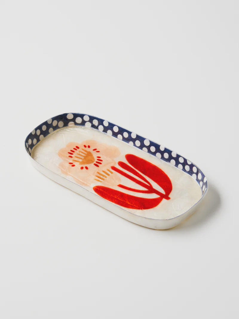 A large bloom holds court in the centre of this Capiz shell tray, creating a luminous stage for perfumes, jewellery, or our Paradis boxes. Hand-crafted by skilled artisans following Sydney designs, each piece celebrates the natural iridescence of the shell through pattern. The Paradis tray brings organised fun to vanities and countertops, its slight variations in pattern a testament to its artisanal origins.