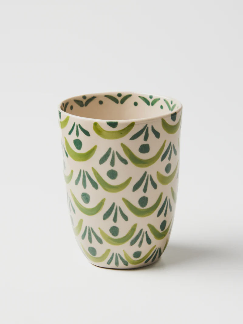 Delicate patterns reminiscent of Mediterranean gardens encircle this artisan-crafted cup, its geometric precision balancing the organic forms of nature. Hand-painted in our distinctive green and white palette, each sip becomes a sensory journey the cup's substantial size making it perfect for coffee and tea or spritzes and cocktails.