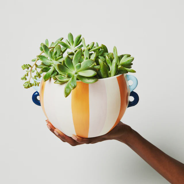 Our multi-coloured Bellini Planter is the perfect home for a small pot plant like a cactus or a fern. We just love the soft pink, tangerine and white stripes with two handles in navy and pale blue. Designed in Sydney and handmade in the Phillipines using locally sourced terracotta clay. Team the Bellini Planter with other pieces in the Bellini range - including vases, bowl, trays and planters - for a fun and vibrant story.