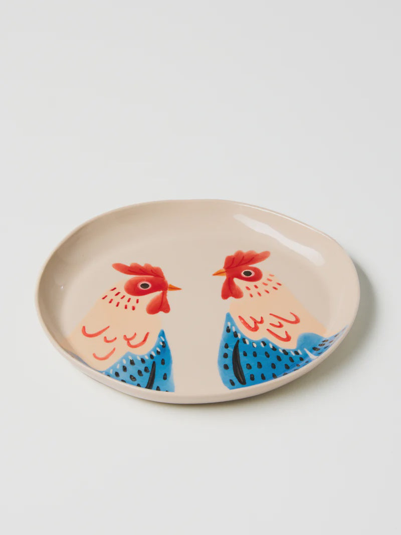 Two cheerful chickens in cornflower blue and coral adorn this pastoral plate, bringing farmhouse charm to all tables. Each piece varies slightly a testament to its handmade nature and the skilled Vietnamese artisans who bring our Sydney studio's vision to life.