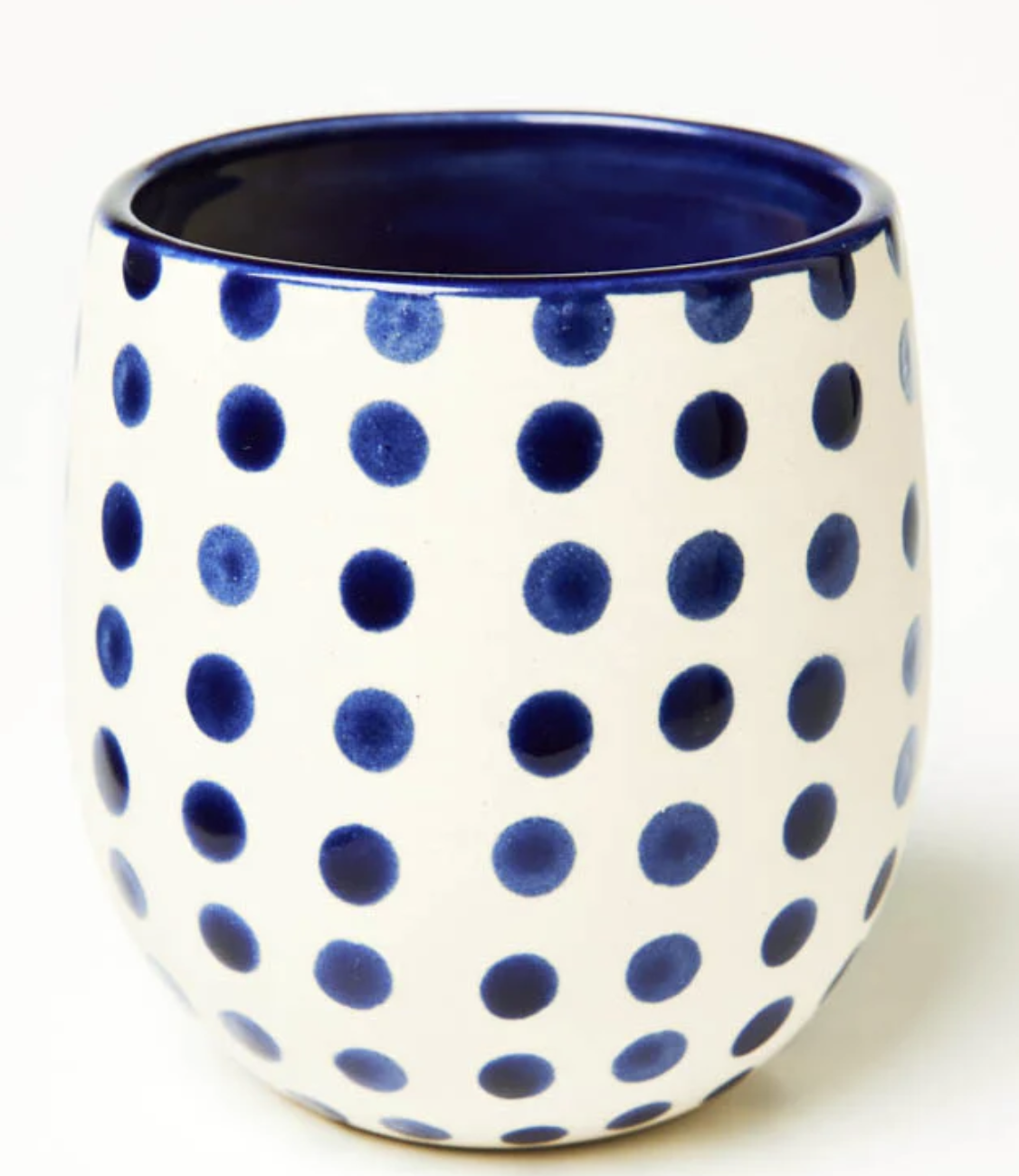 Our Sunday Pots are perfect for any room in the house. Pop in a small succulent, a mini fern. Or as use to hold pens or colouring pencils. Made from earthenware clay, every single pot has been hand-etched and hand-painted with a glossy glaze on top. The detailed handiwork is extraordinary. Buy one as a gift or collect the whole family and keep for yourself! Our Sunday Pot Blue Spot features a hand-painted polka dot design in navy and white with a gloss glaze finish. The interior is a high gloss navy. Designed in Sydney and hand-crafted in Vietnam by Jones & Co artisans.