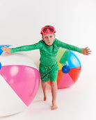 Ah Ken, you've done it again! Beach Days by Kip&Co x Ken Done is our third collection with the godfather of Australian style - a collaboration filled with Aussie inspired prints, and a bucket load of colour. Made from UPF50+ (Ultraviolet Protection Factor) which offers the greatest fabric protection against the summer sun, the Kip&Co x Ken Done Koala Cuddles Green Rash Vest is a long sleeve rashie that features the sweetest little smiling koalas in shades of blue, green and purple on a bright green base.
