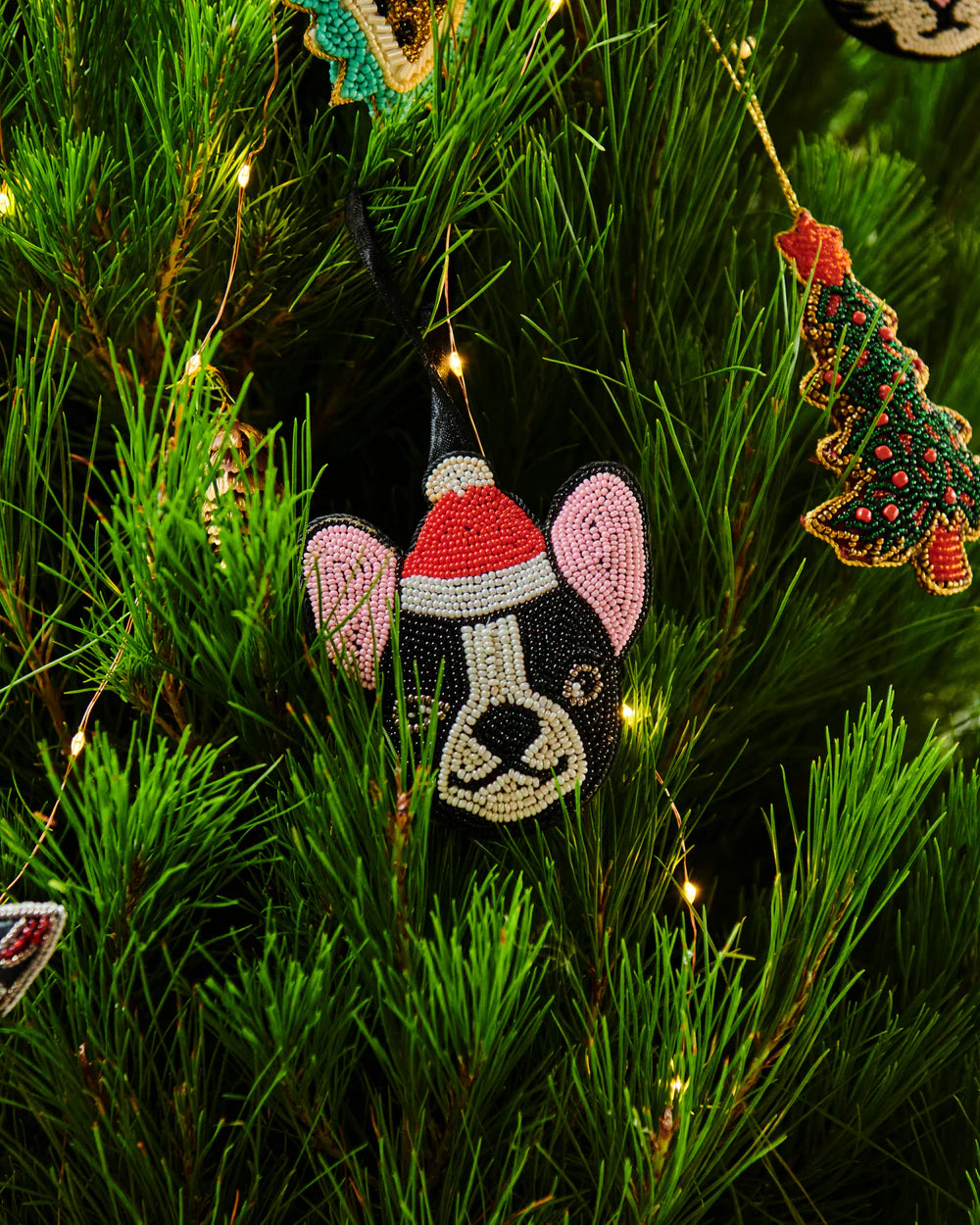It's (almost) the most wonderful time of the year! Let the Christmas spirit run free with our new range of handmade and spectacularly sparkling decorations. With something for every taste whether traditional or ecentric, these decorations are too fun to resist. The Dog Santa Decoration features a beaded black boston terrier dog with a red santa hat. Intricately embroidered and embellished, this is the perfect pressie or keepsake collectable!
