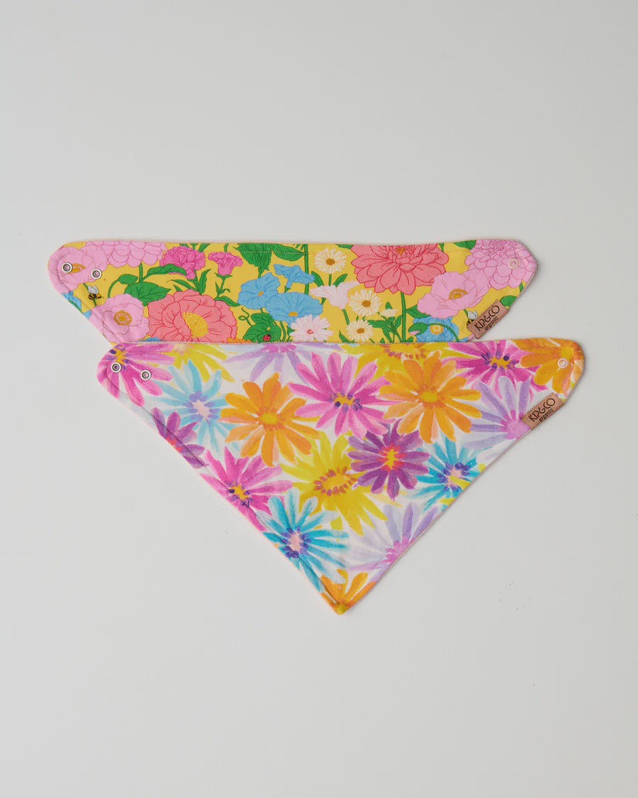 Double the layers, double the fun! Our Flower Power Organic Cotton Dribble Bib Set is made for those adorable (and inevitable) dribbly days. With one side featuring our signature printed organic cotton jersey and the other lined with absorbent cotton terry, these bibs are as cute as they are clever. Soft on little chins and tough on dribbles, they’re perfect for teething tots, messy moments and keeping those sweet outfits looking fresh. Snap them on, soak it up, and let the good times roll. Featuring our Petal Power print with painted daisies in yellow, pink, blue and purple, and our Follow The Sun Yellow print, with illustrated flowers in shades of pink, orange and cornflower blue with a few friendly bees and lady beetles on a sunshine yellow base, both with plain pale pink terry reverse.