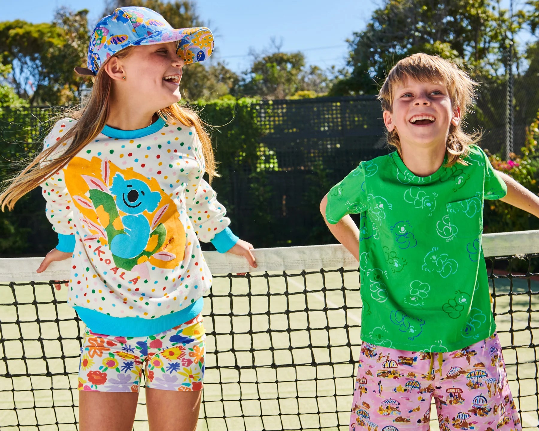 We've been lucky enough to work with iconic Australian artist and our personal hero Ken Done on two smash hit bedding and home collections. And we are jumping for joy to now extend Ken Done into our apparel for our third, and biggest, bestest drop yet! The Kip&Co x Ken Done Koala Cuddles Green Organic Cotton T-Shirt is an everyday staple, jazzed up with Ken Done colour. Made from 100% organic cotton jersey this comfy tee is cuteness overload with the sweetest little smiling koalas in shades of blue, green and purple on a bright green base.