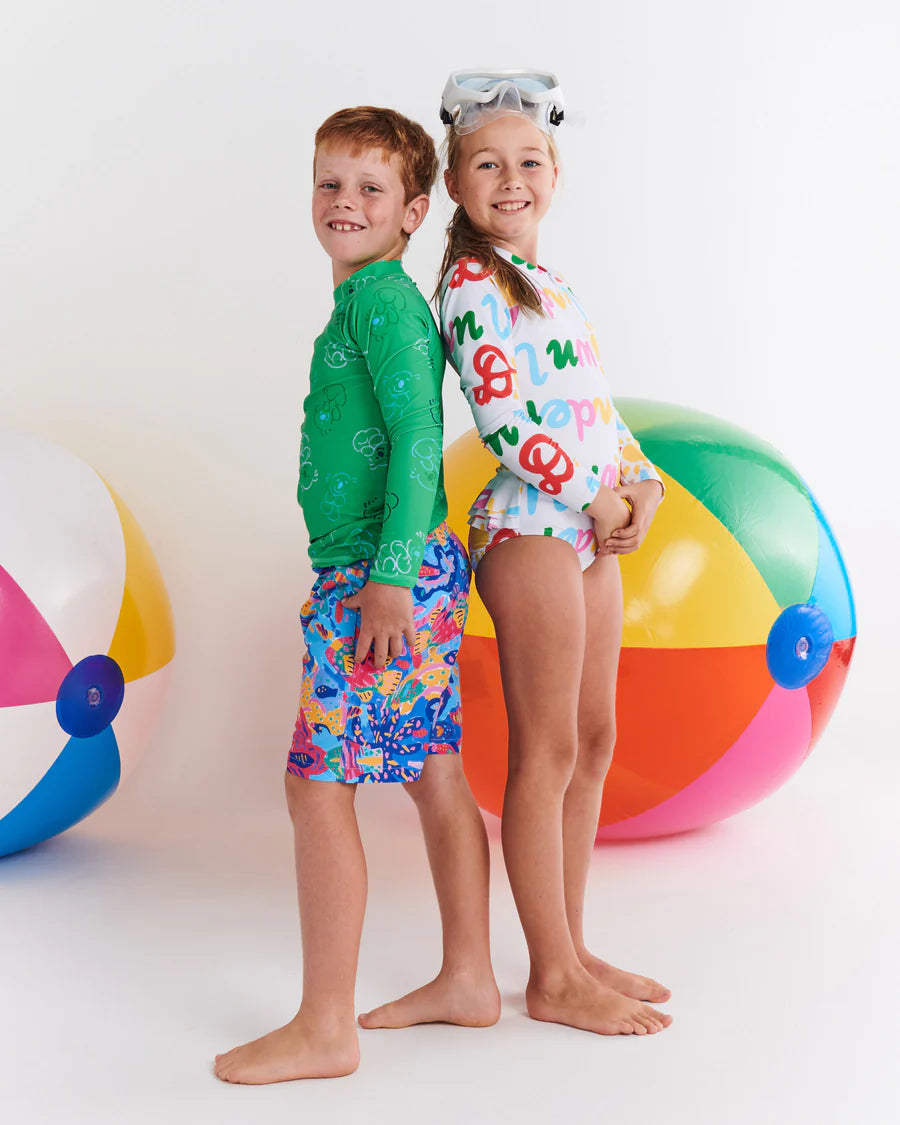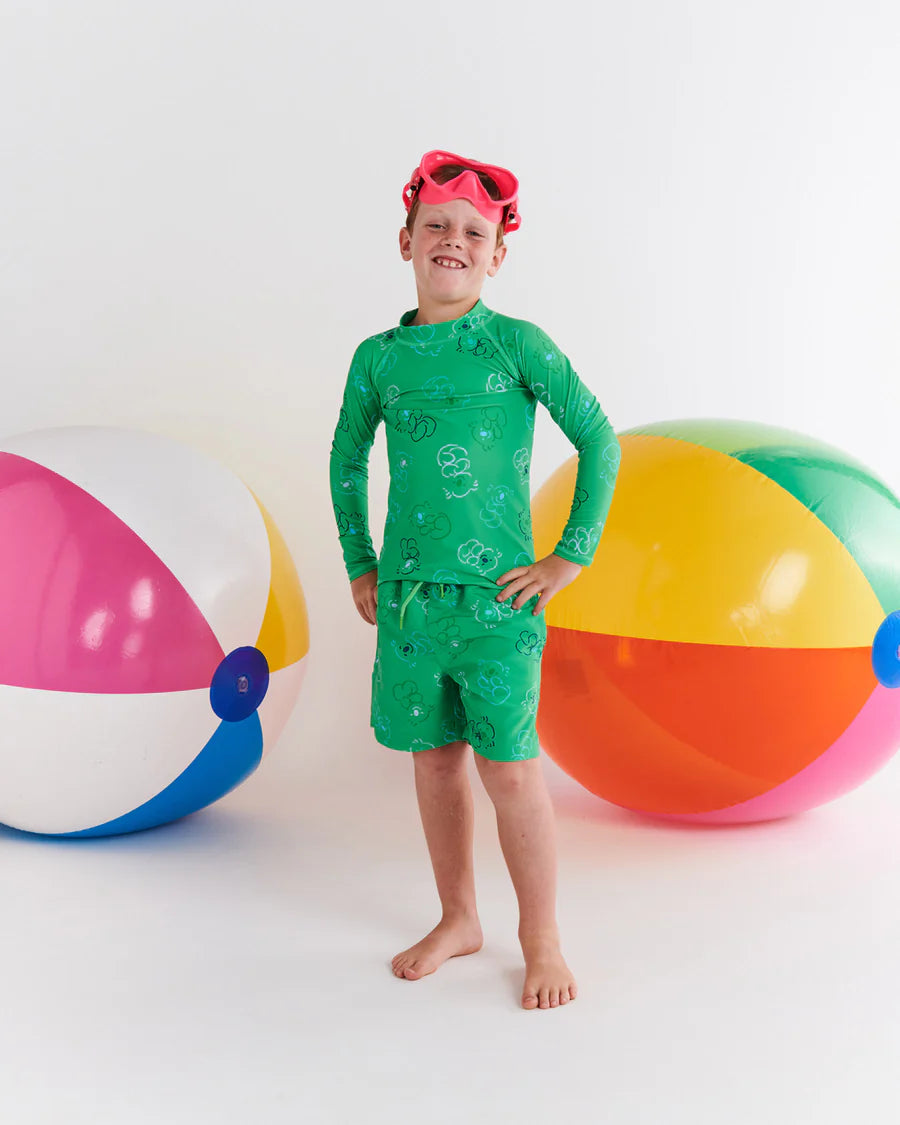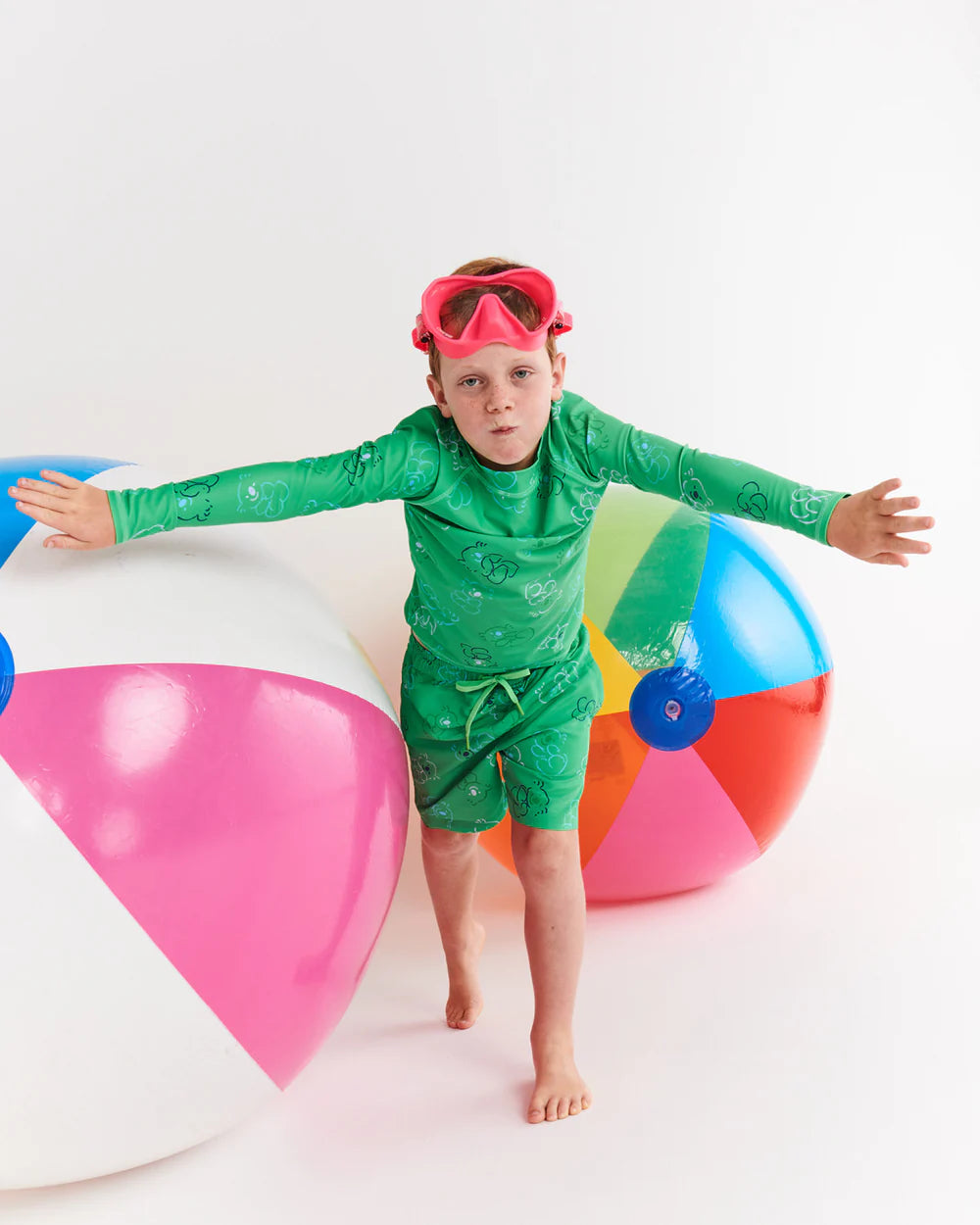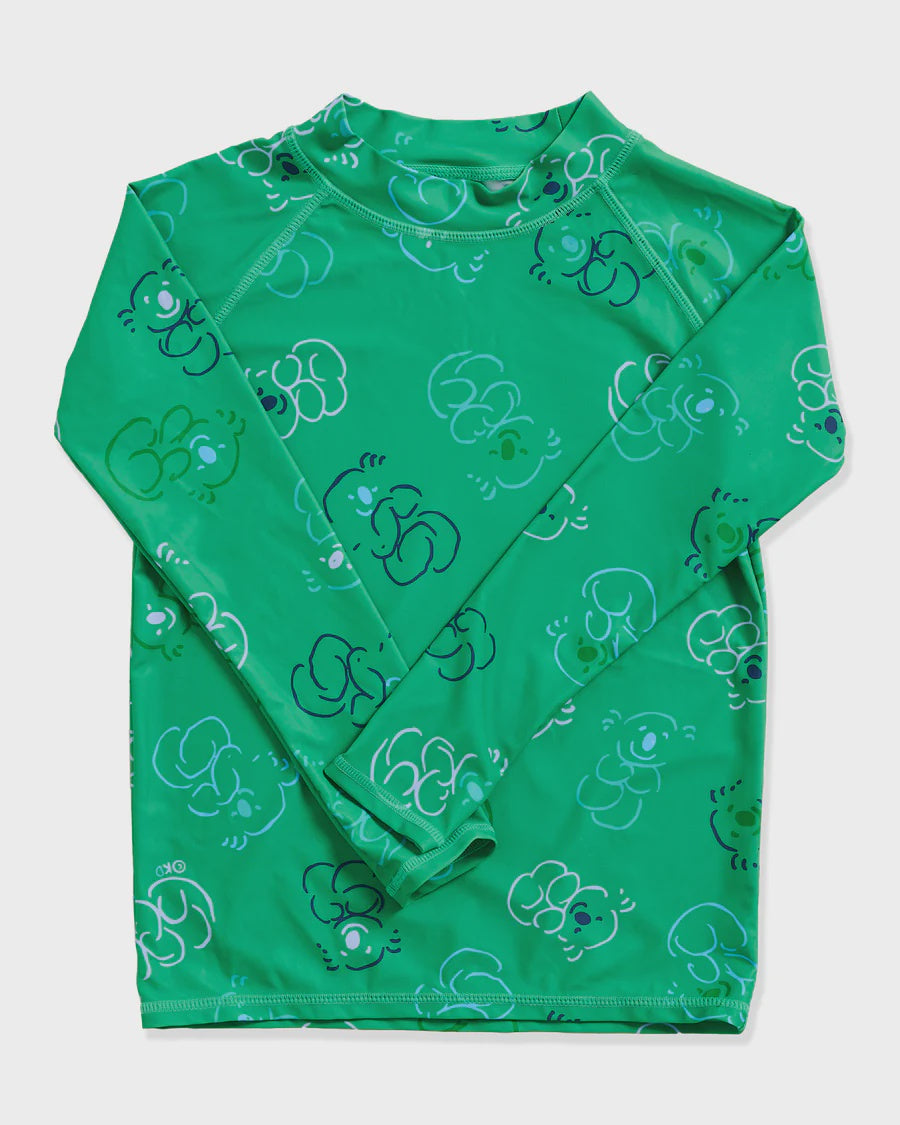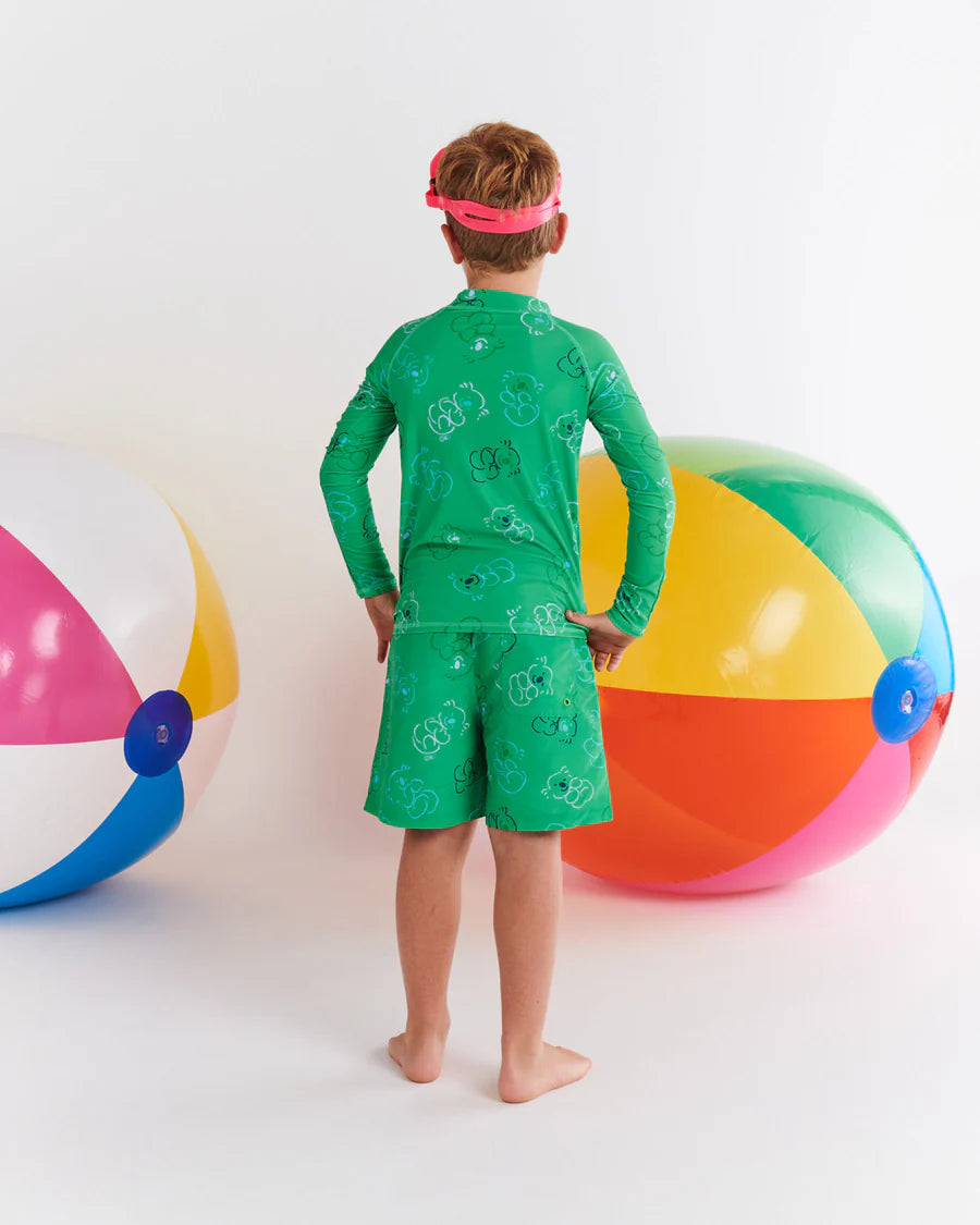 Ah Ken, you've done it again! Beach Days by Kip&Co x Ken Done is our third collection with the godfather of Australian style - a collaboration filled with Aussie inspired prints, and a bucket load of colour. Made from UPF50+ (Ultraviolet Protection Factor) which offers the greatest fabric protection against the summer sun, the Kip&Co x Ken Done Koala Cuddles Green Rash Vest is a long sleeve rashie that features the sweetest little smiling koalas in shades of blue, green and purple on a bright green base.