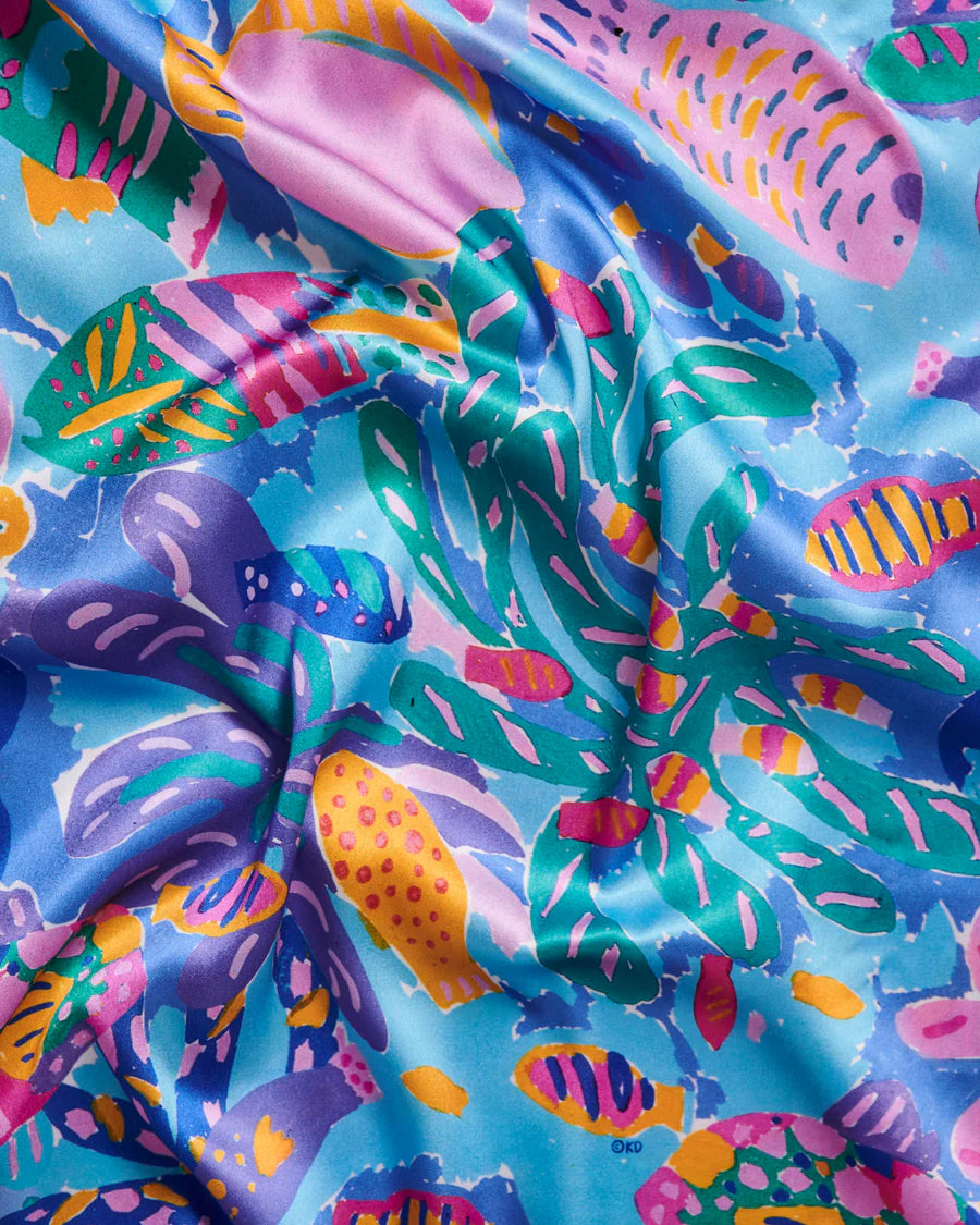 The Kip&Co x Ken Done Reef Garden Satin Robe is a dreamy little number, soft and silky and super lightweight. Made from 100% recycled eco satin, this mini length robe features a wonderous underwater world of fish, seaweeds and coral in rich pastel tones of blue, pink, purple, green and yellow. Wrap yourself in a little Ken Done colour and luxe out in the best of comfort. There's nothing like a little robe time!