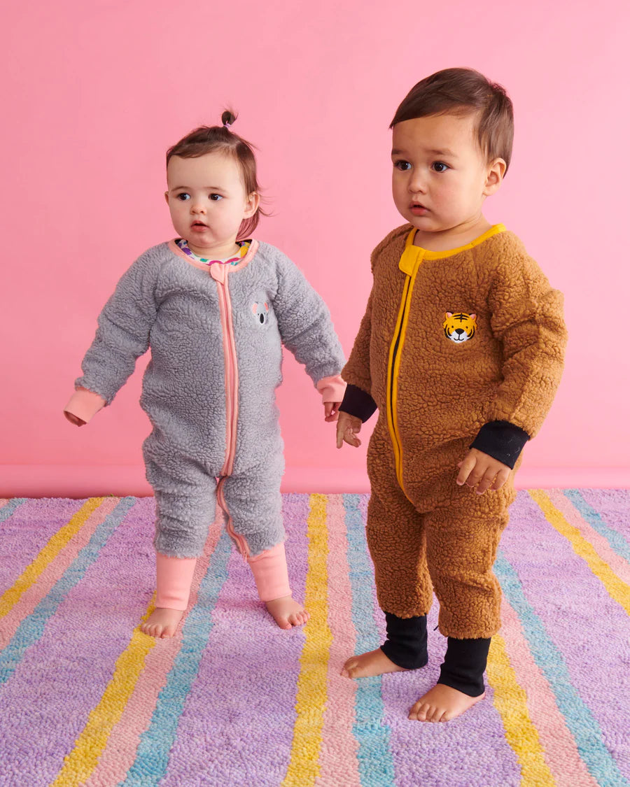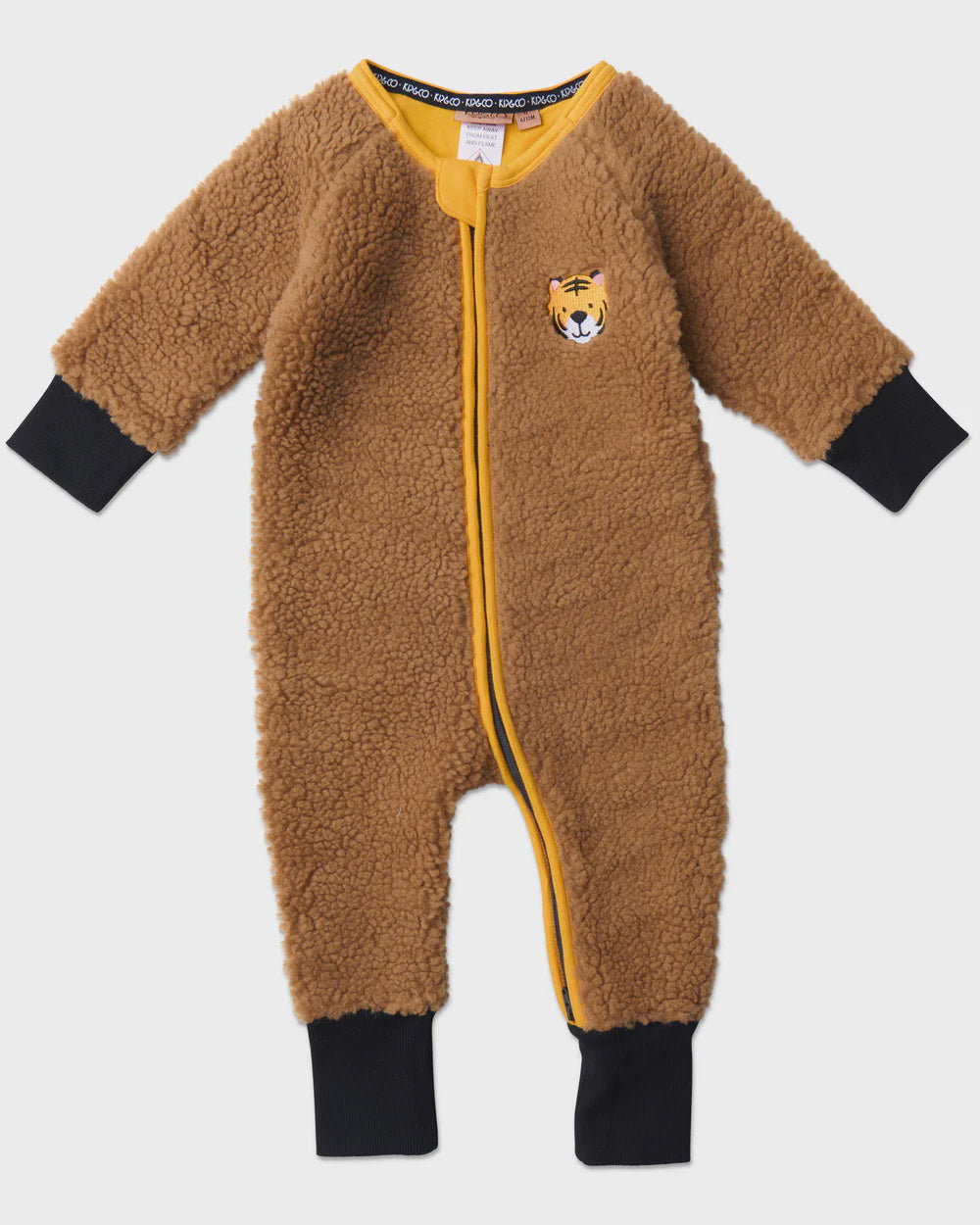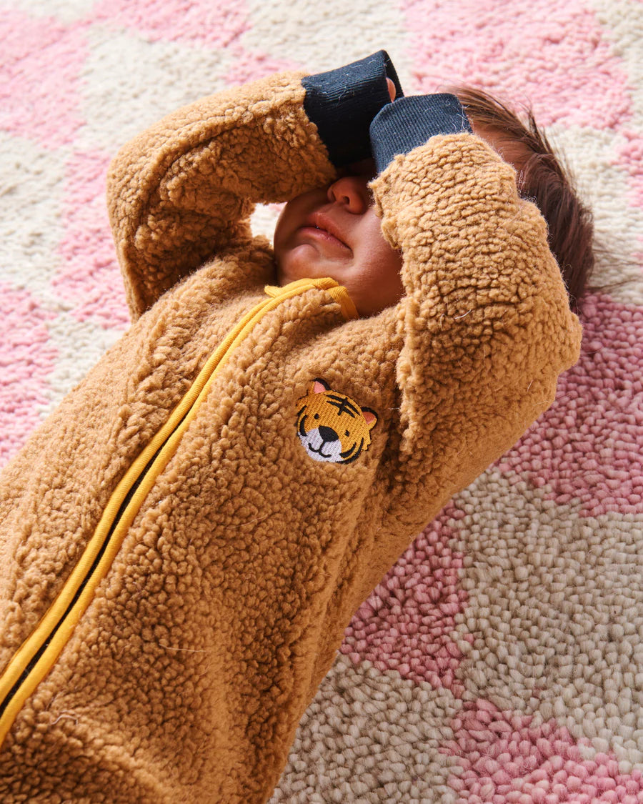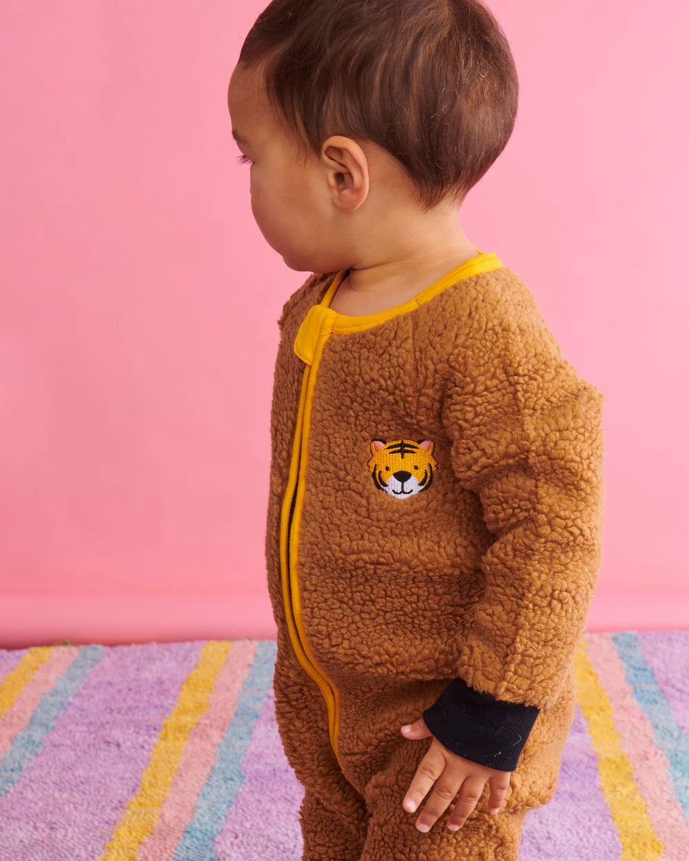The Little Tiger Sherpa Long Sleeve Zip Romper is made from the coziest recycled polyester sherpa, thick and warm and just calling to be cuddled! Featuring a teddy brown sherpa with embroidered tiger face with black cuffs and yellow zip details. This textural winter warmer is all about keeping your baby nice and snug, and oh-so-adorable, with easy-zip feature to ensure fuss-free dressing and quick diaper changes. Pair with our much loved baby booties for a toasty warm fit suitable for all-kinds of winter days at home or out and about.
