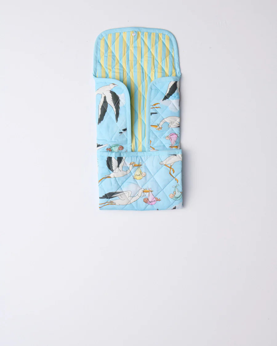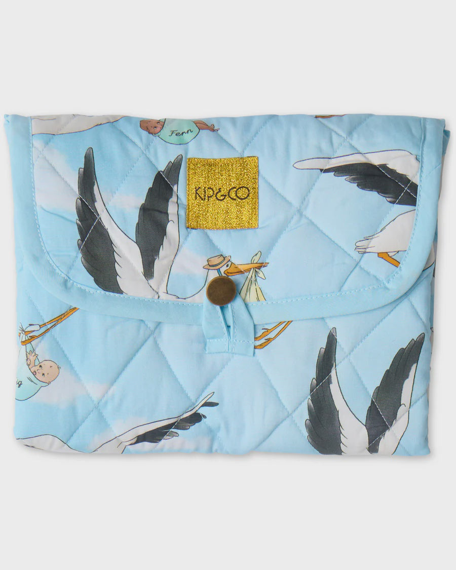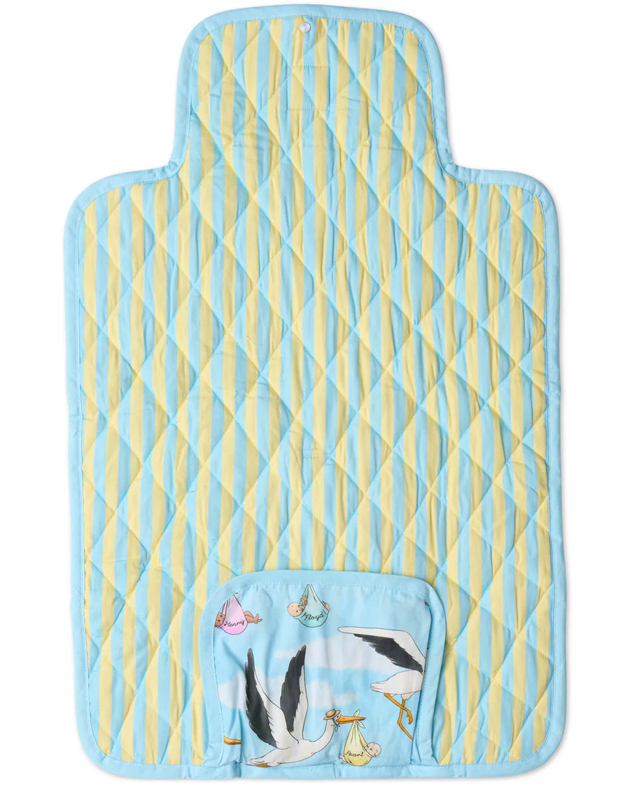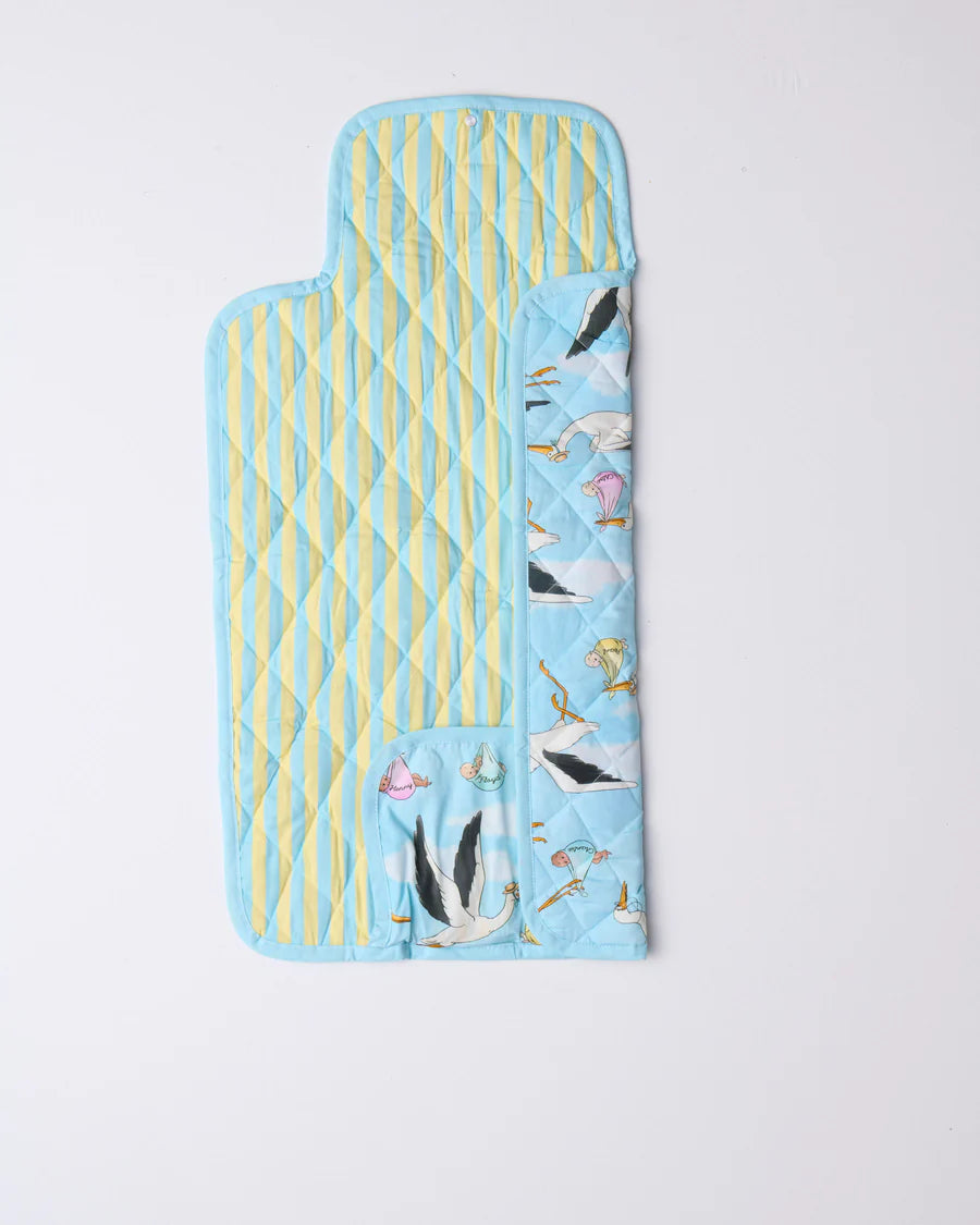 Make changing on the go a breeze with our handy travel change mat pouch. Made from quilted organic cotton canvas, this fold up change mat is a little layer for comfort and cleanliness when out and about. The Special Delivery Baby Change Mat features a charming design of blue skies with stalks delivering the most adorable baby bundles, reversed with a simple blue and yellow stripe pattern. Machine washable and easy flip and fold, keep this little gem tucked away in your baby bag for one less thing to think about!