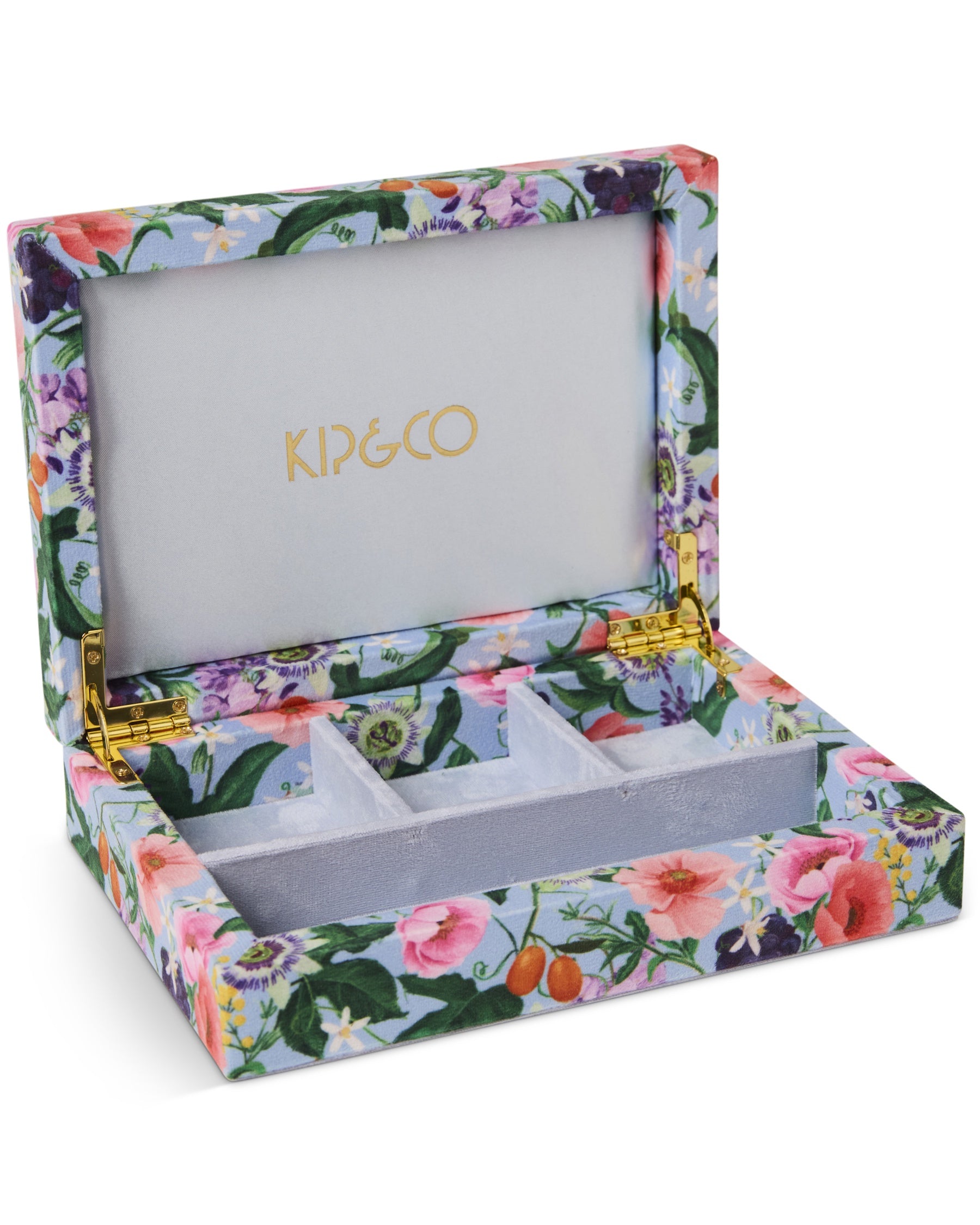 Pretty, practical, and perfectly sized! The Spring In The Air Velvet Jewellery Box Small is covered in soft blue velvet, adorned with a stunning mix of springtime florals and fresh fruits, and lined with a matching pale blue interior. It’s a little pocket of floral charm to store your cherished treasures. With three small compartments and one long section, this jewellery box is perfect for rings, earrings, chain-link pieces, and other fine jewellery, all your favourite little bits kept safe and sound.