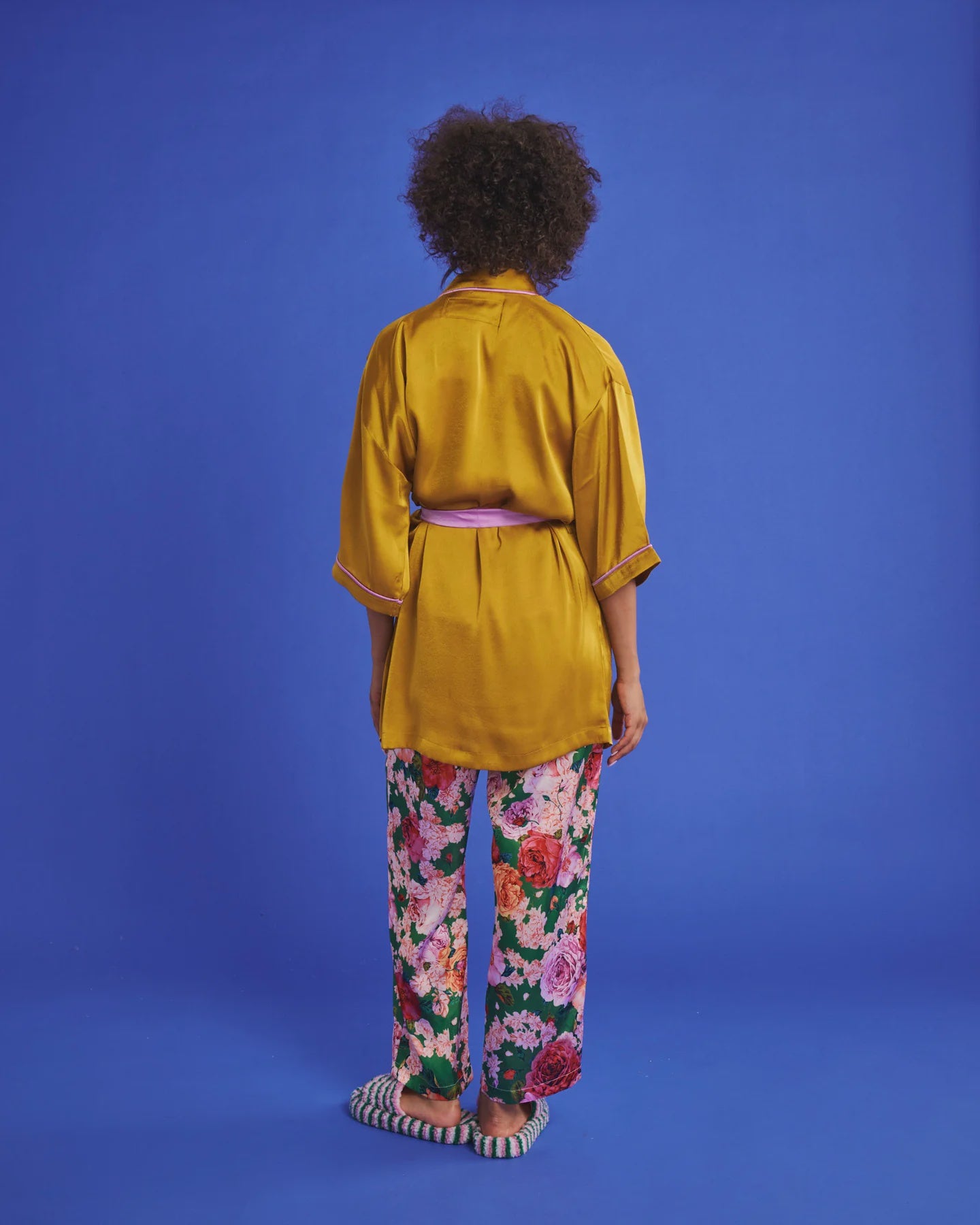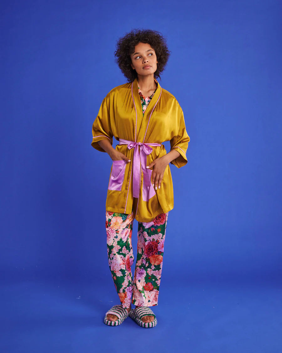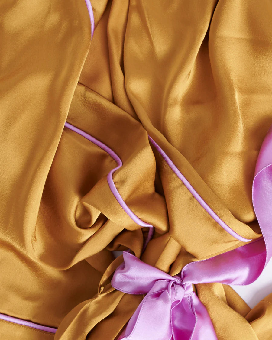 Made from lustrous 100% recycled eco polyester satin, the VaVaVoom Satin Robe is a golden beauty with contrast violet purple pockets and waist belt tie. Designed to keep you cool and comfortable, the lightweight satin fabric ensures a breezy feel, ideal for balmy summer evenings.