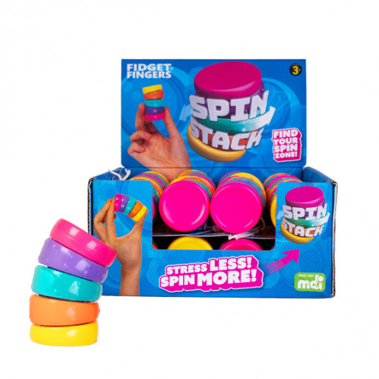 Get fidget fun at your fingertips with Spin Stack! This interactive toy features five colourful discs that spin independently while staying connected. With a comfortable thumb indent and a mix of smooth and textured surfaces, it's as satisfying to touch as it is to watch. It's a spinning sensation!