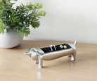 COMING SOON - A playful dachshund-inspired ring holder, the Dachsie Ring Holder holds and protects your rings with its velvet padded base. Made of cast metal with a shiny metallic finish, this ring holder is easy to clean and makes for a perfect gift to any family, co-worker, or friend. Its sleek design ensures it complements a variety of other décor whether placed on your nightstand, dresser, or desk. With ample storage, this ring holder can hold multiple rings of various sizes.