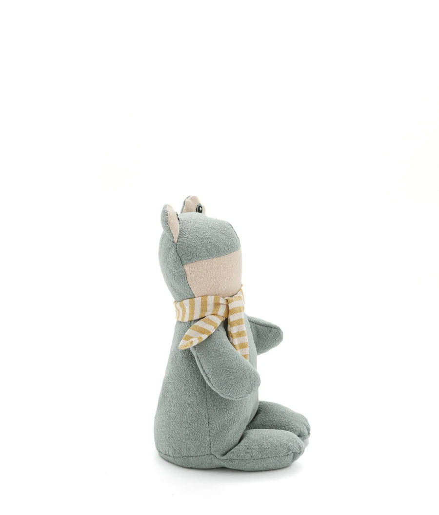 Friendly, fanciful Forrest the Frog is a cuddly weighted toy who enjoys the simple things in life. Forrest sometimes worries that lions, tigers and bears are coming to eat him, so he always wears a cosy striped scarf with his best friend Beatrix the Bunny to make himself feel safe & secure. Gentle Forrest loves a hot cup of fruit-fly cocoa at twilight, long leisurely walks across the lily-pads of his pond, & watercolour painting.