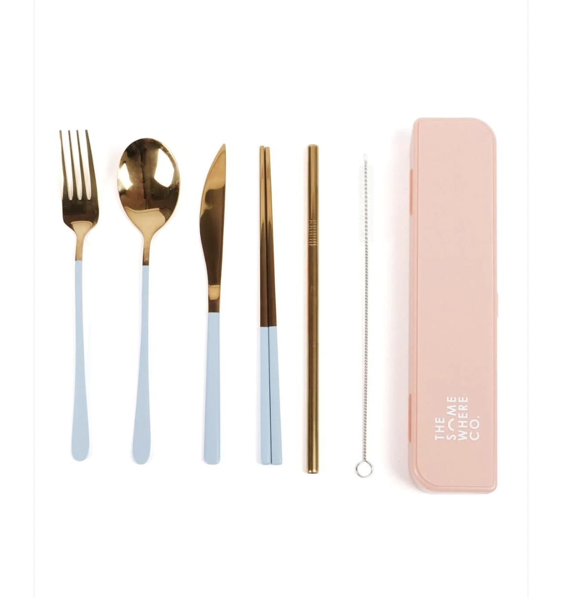 - 7 piece kit - Gold stainless steel (with powder blue handles) knife, fork, spoon, chopsticks, medium straw, straw cleaner, recycled pink plastic container