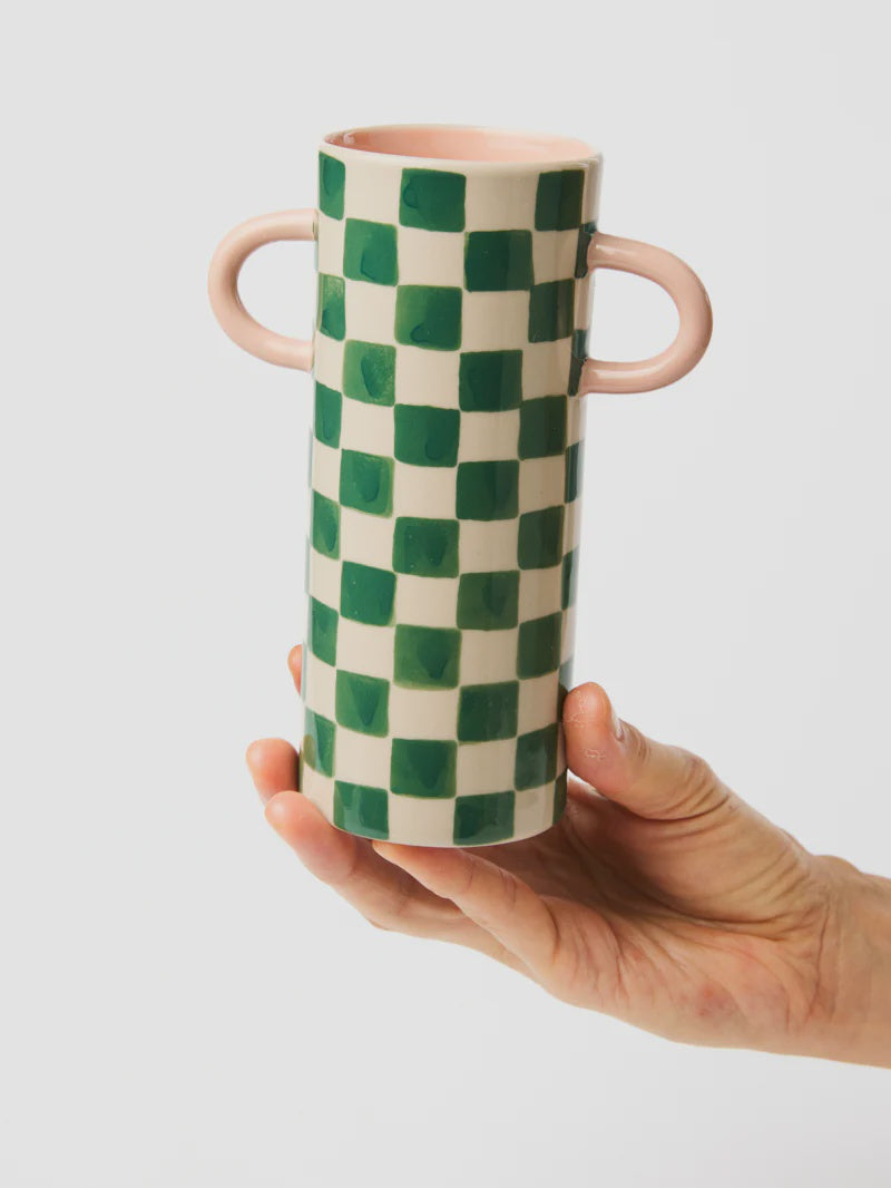 Cream and forest green checkerboards dance across this cylindrical vessel, creating a rhythm of pattern that feels very contemporary. The twin handles, invite interaction, while the hand-painted surface speaks to the artisan's confident brushwork. Perfect for a few sprigs of green or a single stem, this vase transforms even the most modest botanical into a statement.