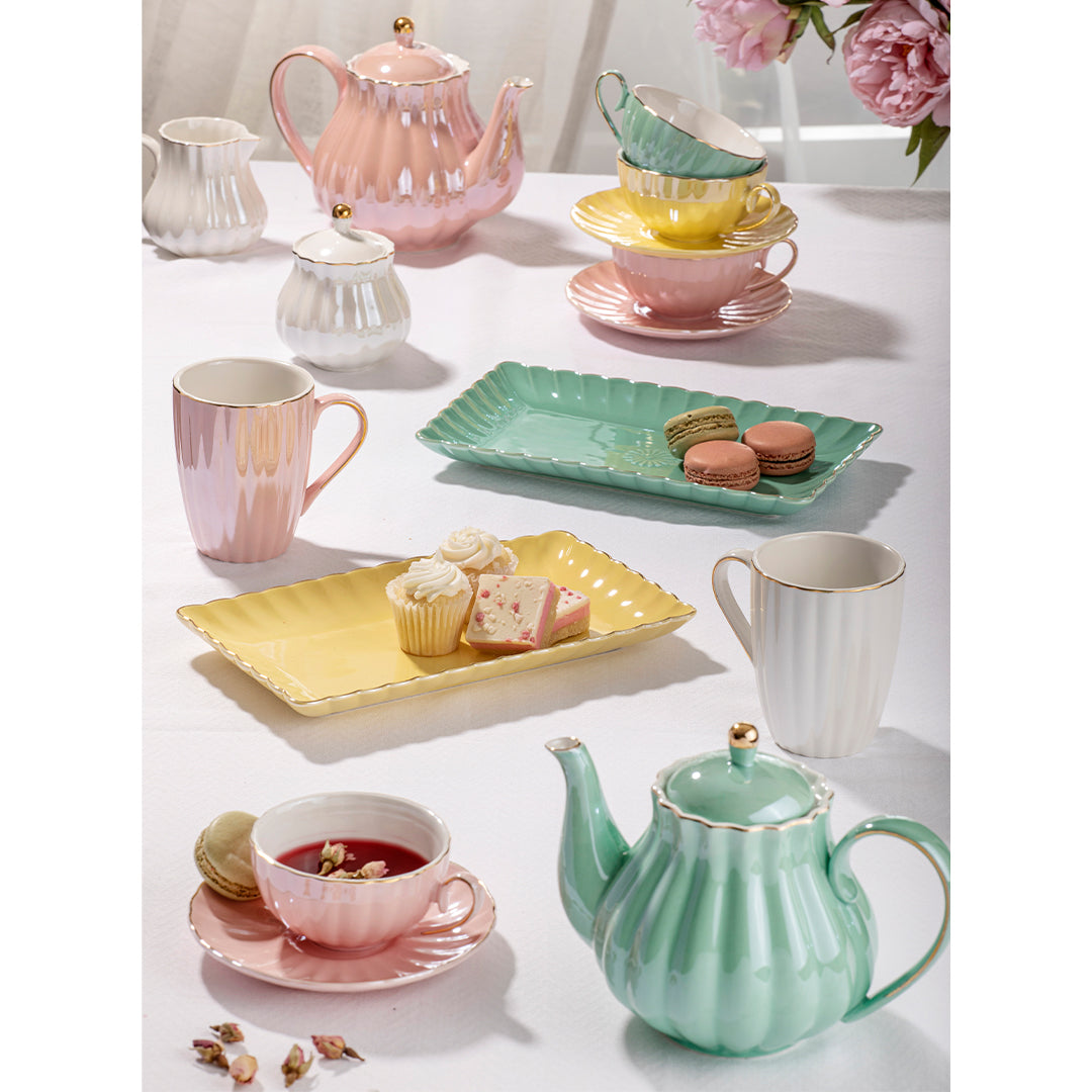The Parisienne Pearl collection is the epitome of opulent French elegance. It features a stunning pearlescent finish, complimented by soft scalloped detailing, a sweet pastel palette and a touch of luxury with its gold trims. High tea anyone?