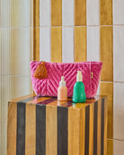 The beauty bag everyone loves. Our best-selling quilted velvet toiletry bag is back to carry your everyday bits in cushy, velvety style. Soft to touch, bold to behold, and roomy enough for your daily must-haves, this bag is proof that practical can also be seriously pretty. The Pink Velvet Toiletry Bag features a hot pink velvet with contrast orange tassel zip. Pair with matching Pink Velvet Cosmetics Purse for a dream team beauty duo.