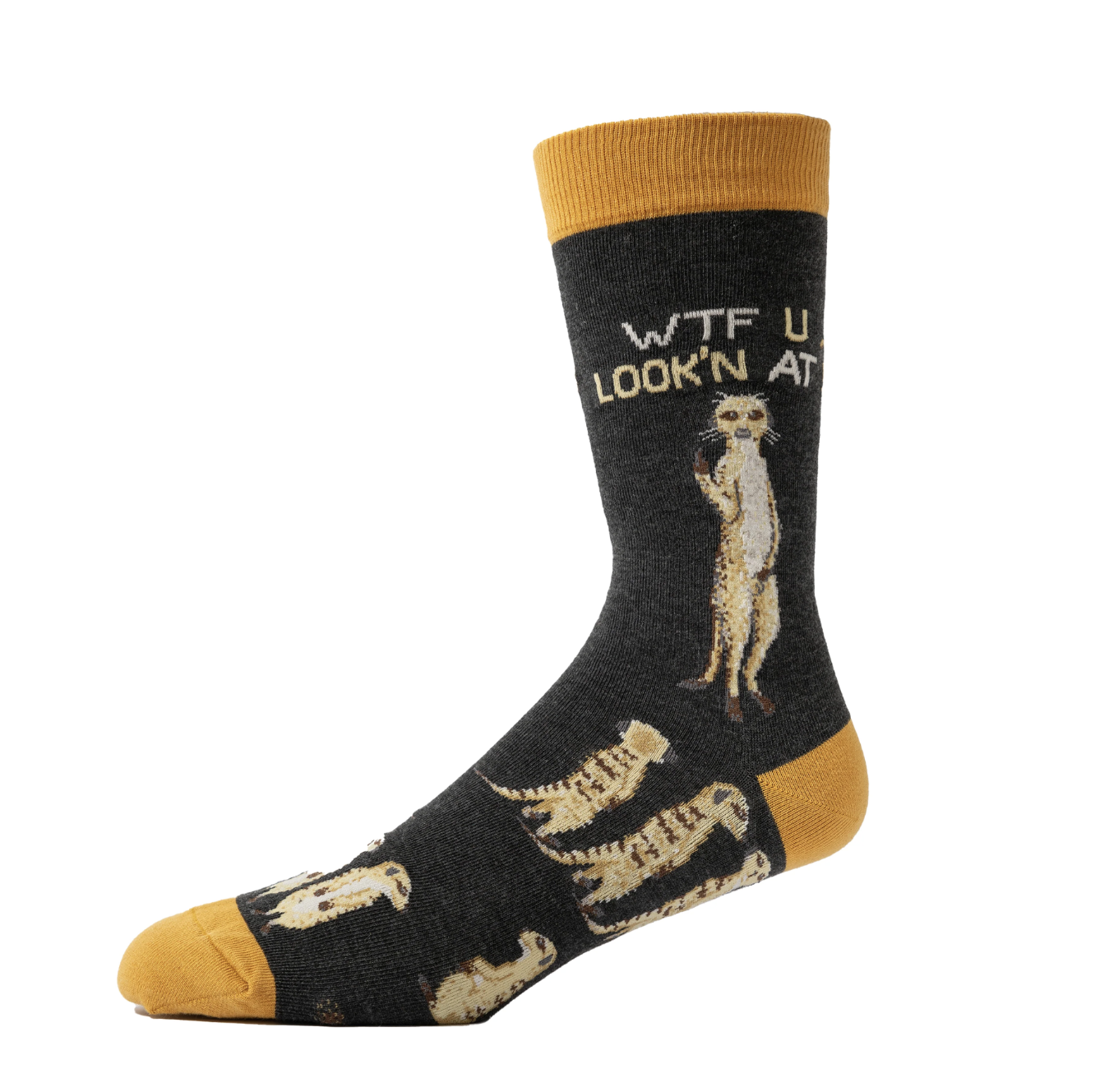 Unleash your wild side with our "Meerkats! WTF U Look'n At?" socks! These eye-catching beauties feature a gang of cheeky cartoon meerkats with exaggerated expressions that are sure to turn heads. Set against a sleek black background, these little critters seem to be asking the question we're all thinking - what ARE you looking at?