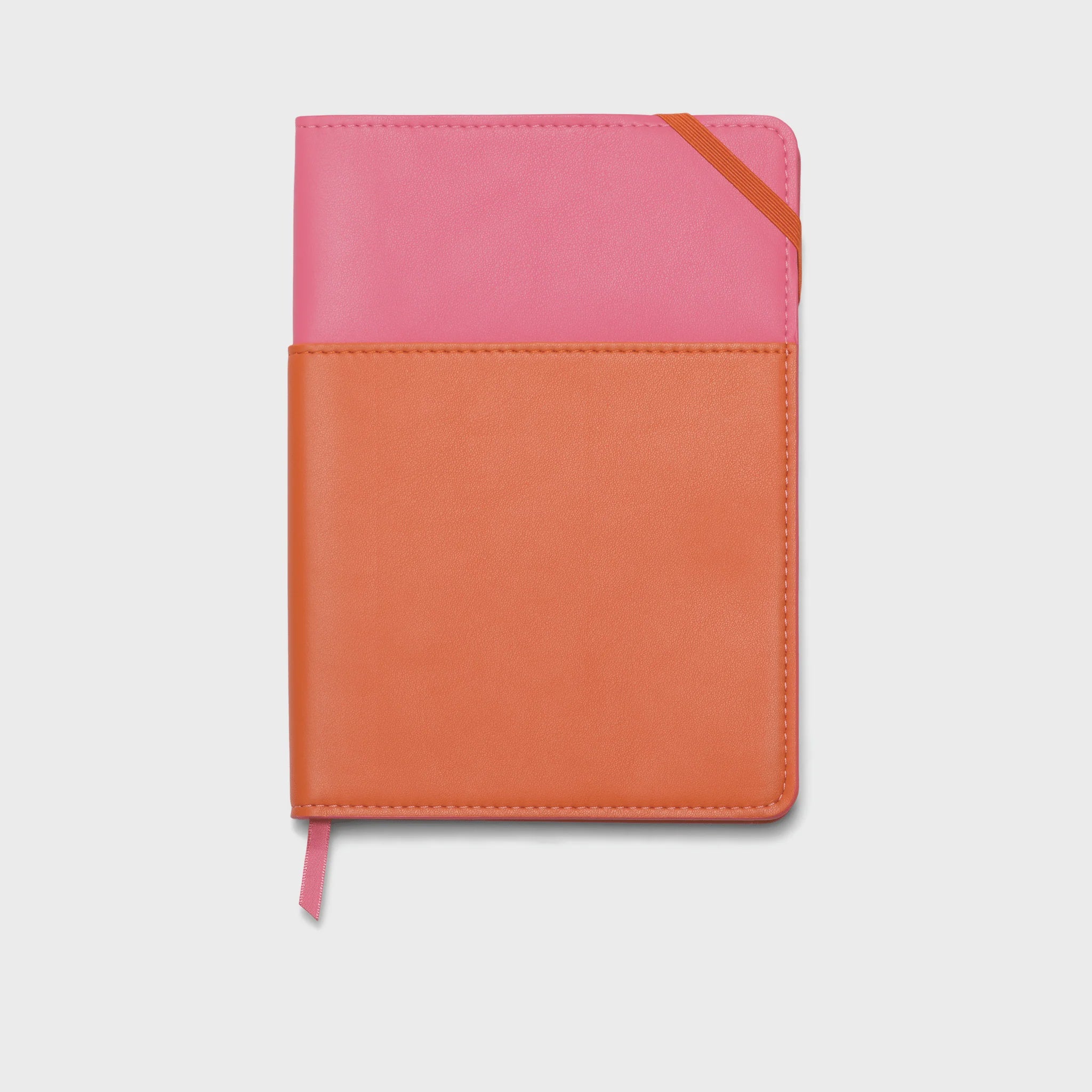 Meet our Vegan Leather Pocket Journal - Pink + Chili. It's bold, it's bright, and it's brimming with storage potential. Covered in a buttery soft vegan leather, this journal stores all of your loose-leaf treasures in the full wrap-around pocket, color blocked for maximum cuteness. Oh, and each journal includes an elastic closure for security as well as a satin ribbon marker for keeping your place. So keep on stockpiling your ticket stubs and take-out menus…just do it in style.