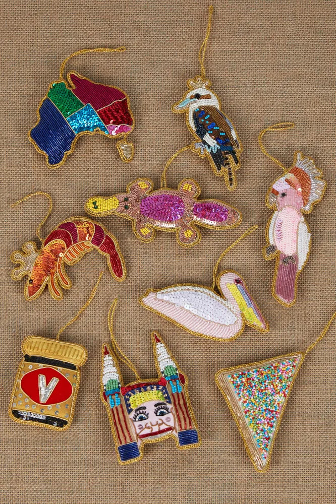 Trim your Christmas tree an Australiana themed sequinned decoration. Featuring quirky details with lightweight beading and sequins, Vixen & Velvet decorations will definitely add some personality to your tree this year.