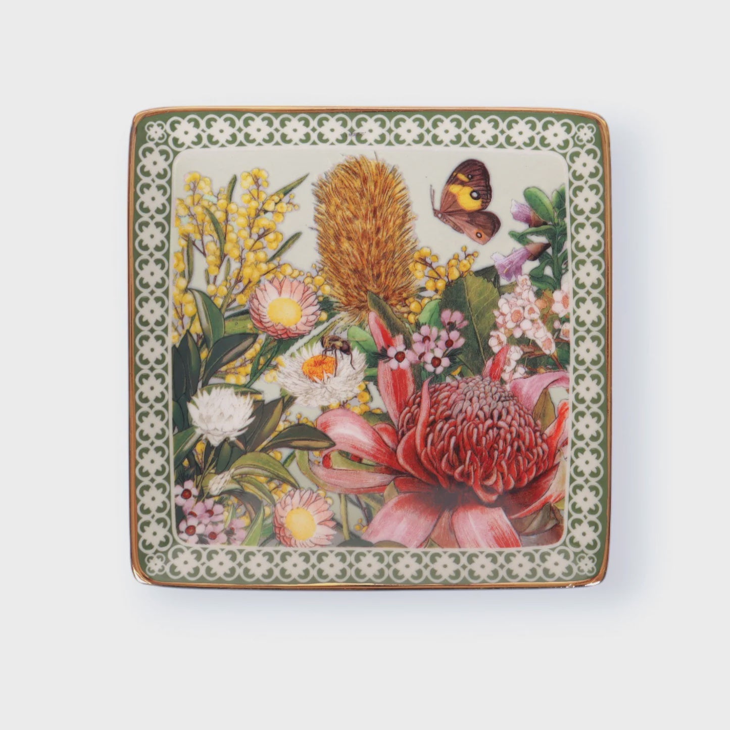 Crafted from premium new bone china, the Botanical Blooms Trinket Tray features a gold-rimmed artwork with stunning illustrations of native Australian florals. Created by the talented La La Land artist Laura Ramos.