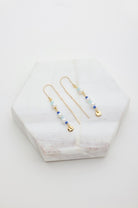 The Alice Thread Earring in gold and blue enamel is sleek and playful, with a delicate chain drop design.