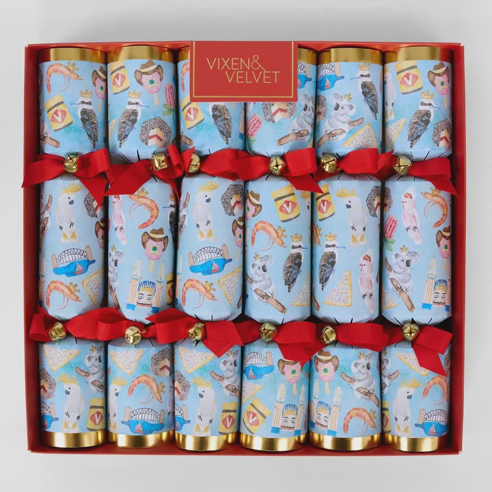Fun, Quirky and full of Aussie festive cheer, Aussie Crackers feature all our classic icons, prawns, vegemite, sydney harbour bridge, finished with shimmering foiled edges and playful red bow and bell.